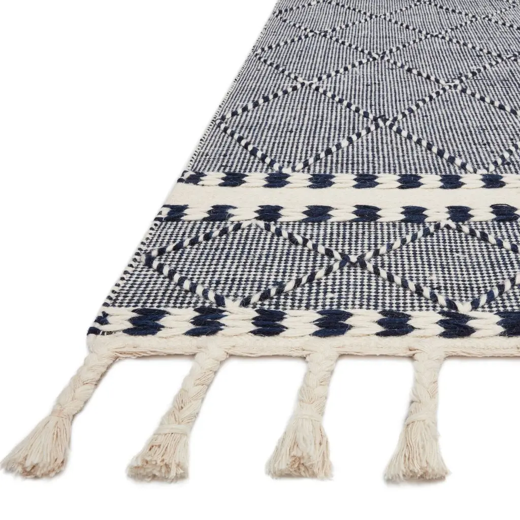 With its varied weaves and braided fringe, this hand-loomed rug is a testament to time-honored artistry. The navy-and-white palette and the geometric motifs make it a welcome addition to classic and contemporary rooms alike. A rug pad is recommended to help prevent slipping and extend the life of your rug.