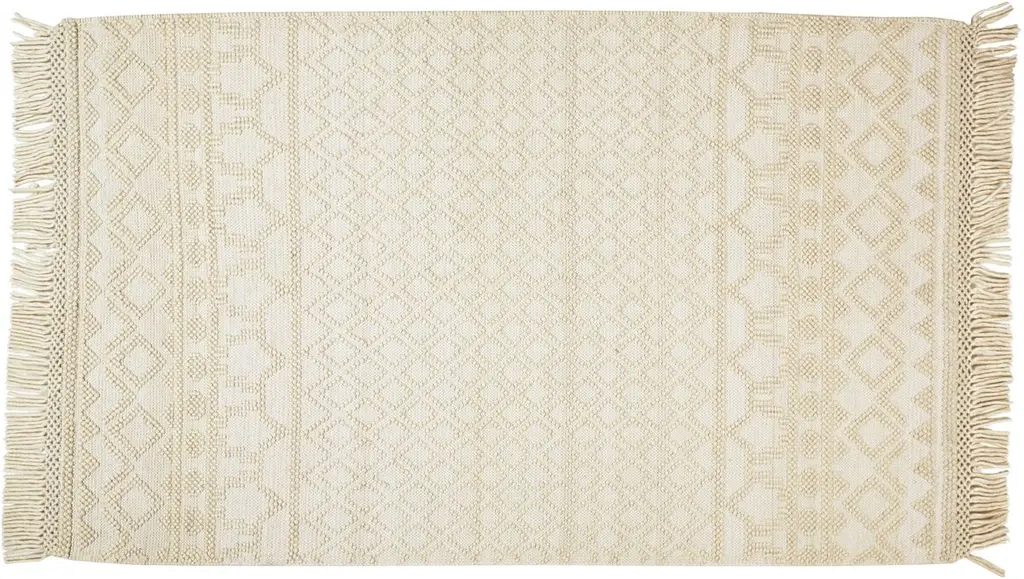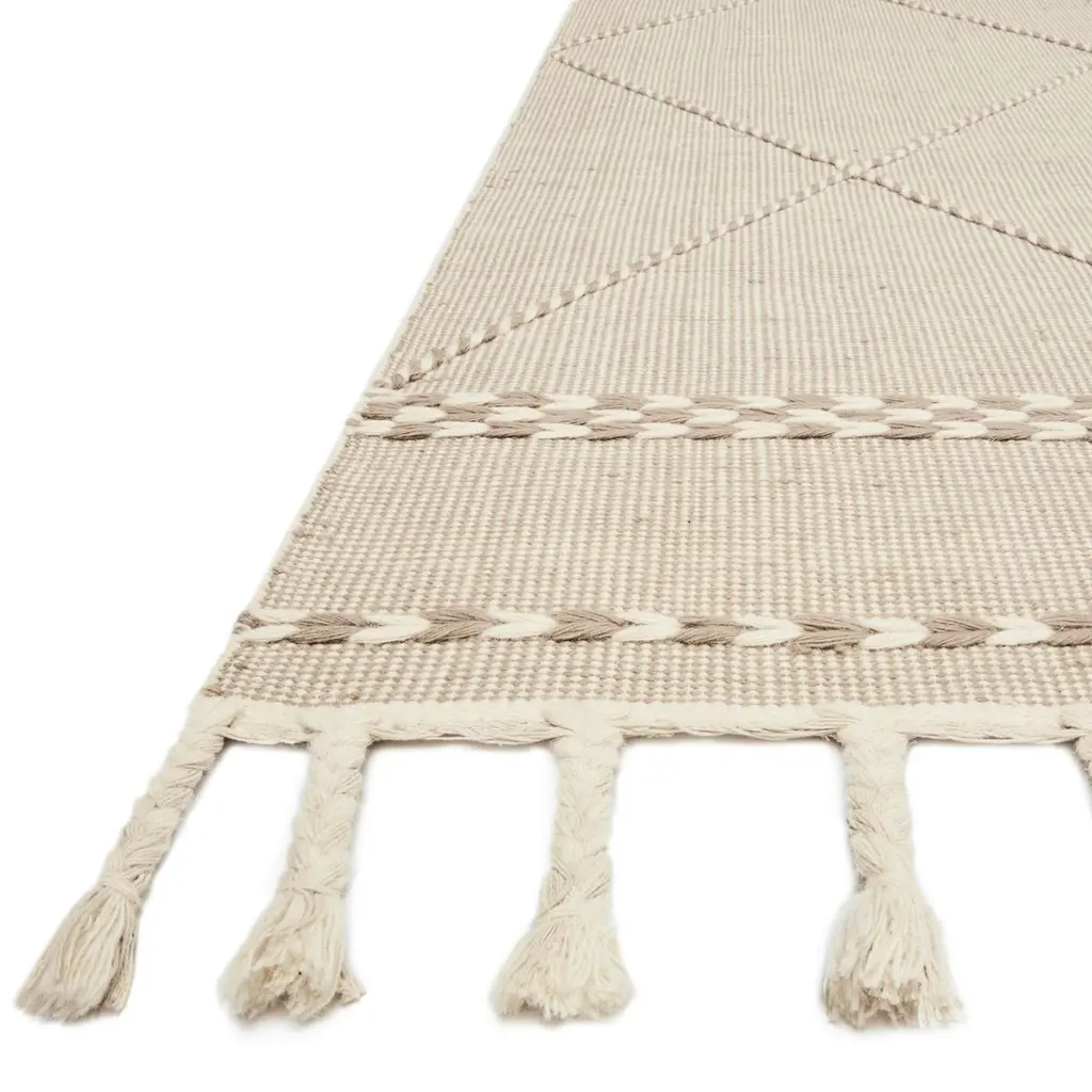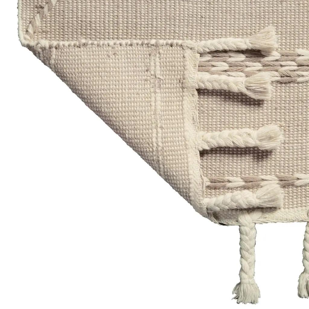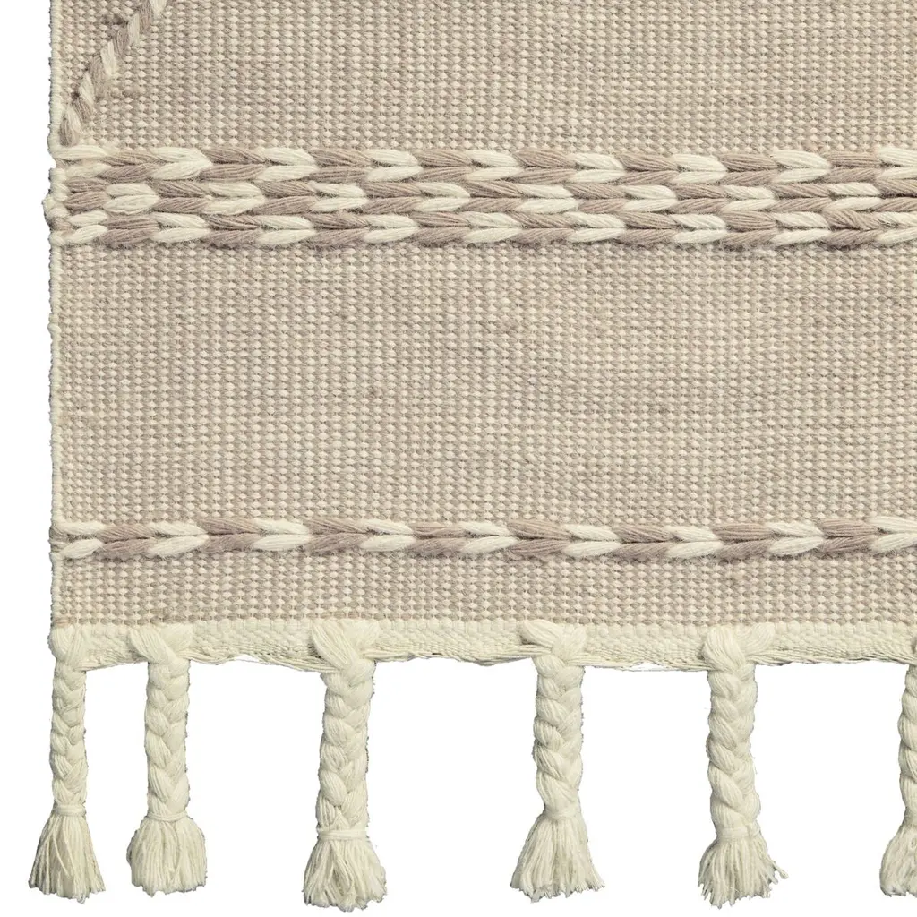 With its varied weaves and braided fringe, this hand-loomed rug is a testament to time-honored artistry. The neutral palette and the geometric motifs make it a welcome addition to classic and contemporary rooms alike. A rug pad is recommended to help prevent slipping and extend the life of your rug.