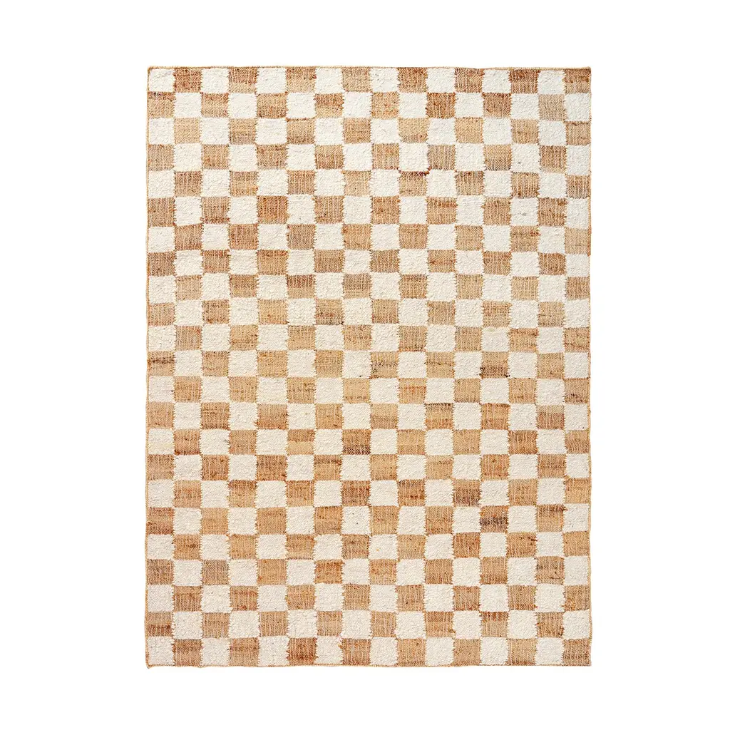 The Check Wool Jute Rug blends soft wool and natural jute in a classic checkered design. The hand-carded wool creates a distinct, irregular texture that adds depth and character. Offered in off-white/natural and coffee/natural color combinations, the rug's neutral palette suits different interior settings. Its rectangular shape and flatwoven construction make it ideal for living rooms, hallways, or bedrooms.