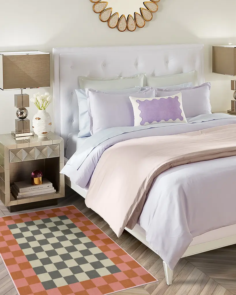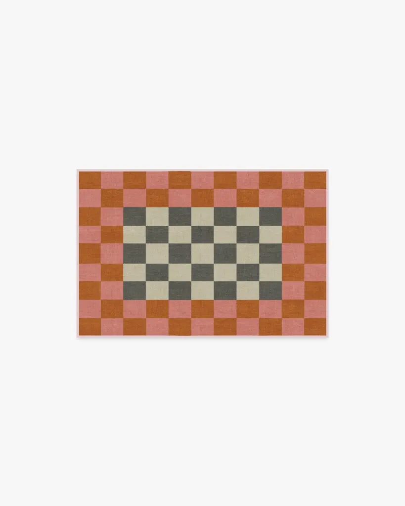 Indulge in modern glamour with our Jonathan Adler Checker Border Pink & Orange Rug. This bold take on a classic checkerboard design pairs bright pink and orange with soft grey and cream accents for a cheerful statement. Water-resistant, stain-resistant, and machine-washable. Rug colors may vary slightly according to your device and the lighting in your space.