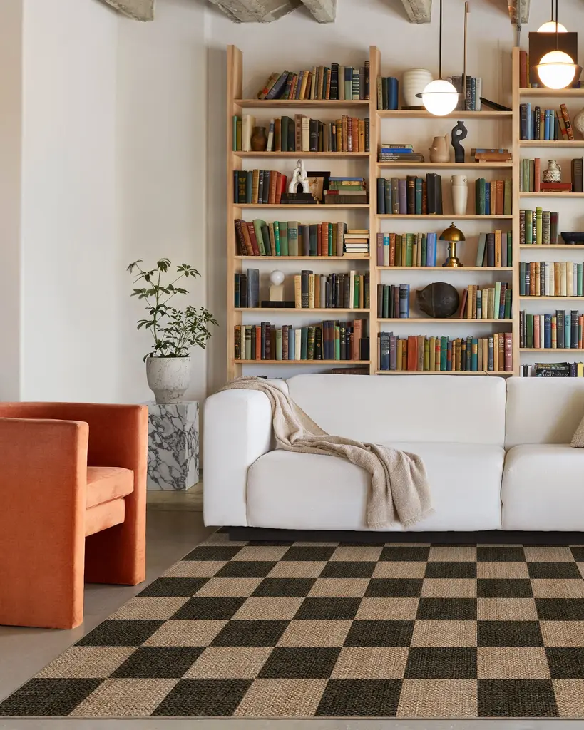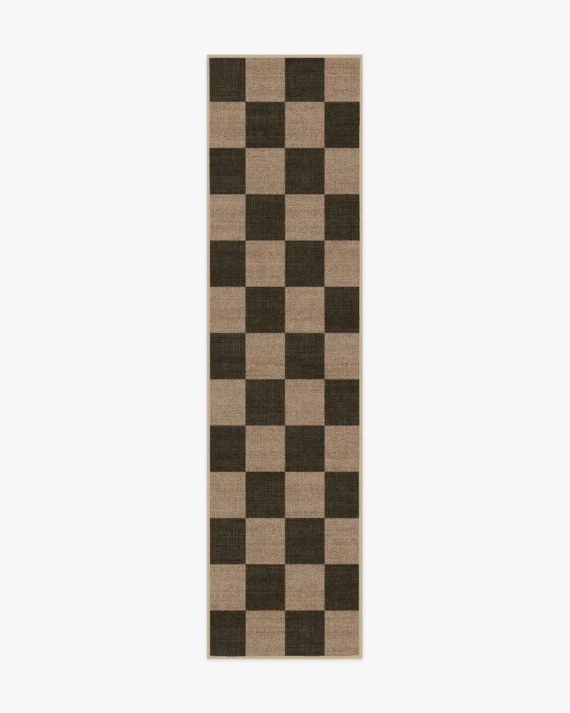 A classic pattern that's sure to turn heads every time. Our Checkerboard Soft Black Re-Jute Rug features a bold geometric pattern in weathered black on a warm beige background that gives off the regal ambience of vintage Italian flooring. The woven jute-like material is made from recycled and virgin polyester, and polyurethane that won't shed or fray. Water-resistant, stain-resistant, and machine-washable.