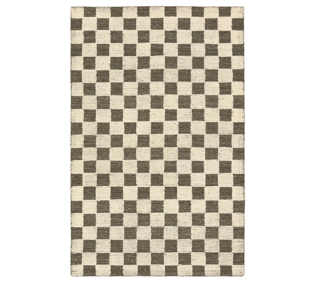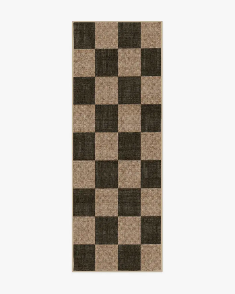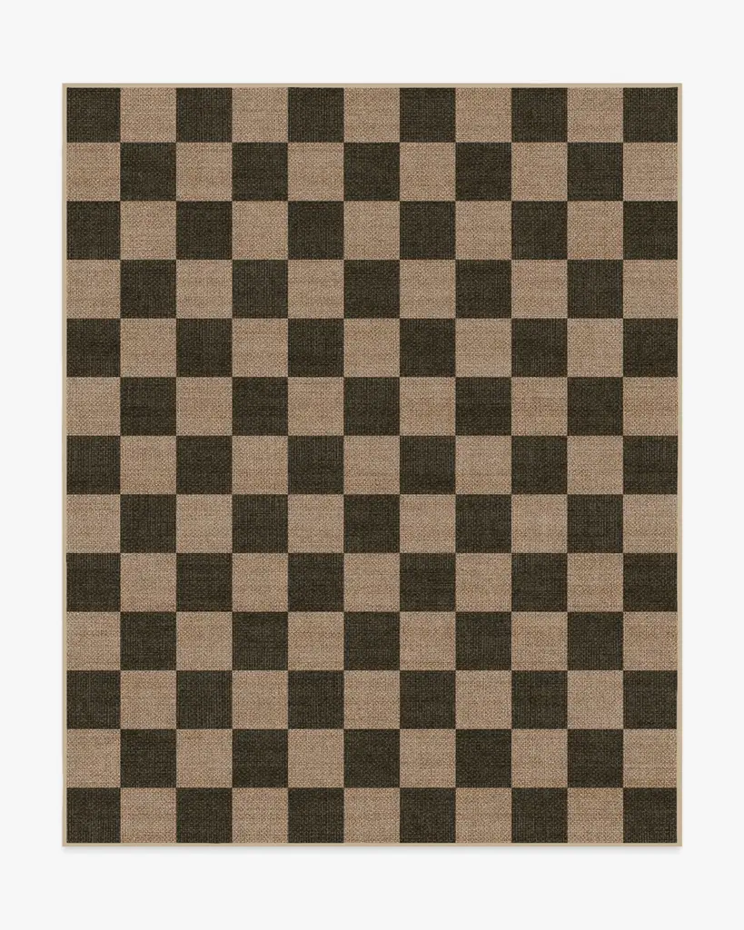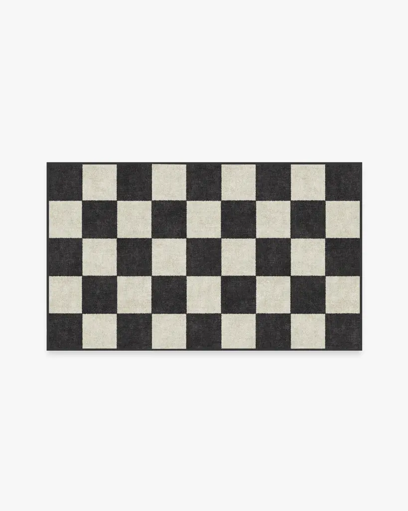A classic pattern that's sure to turn heads every time. Our Checkerboard Soft Black Re-Jute Rug features a bold geometric pattern in weathered black on a warm beige background that gives off the regal ambience of vintage Italian flooring. The woven jute-like material is made from recycled and virgin polyester, and polyurethane that won't shed or fray. Water-resistant, stain-resistant, and machine-washable.