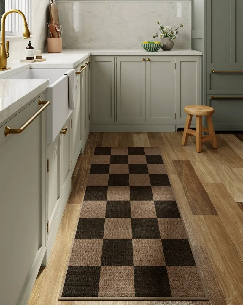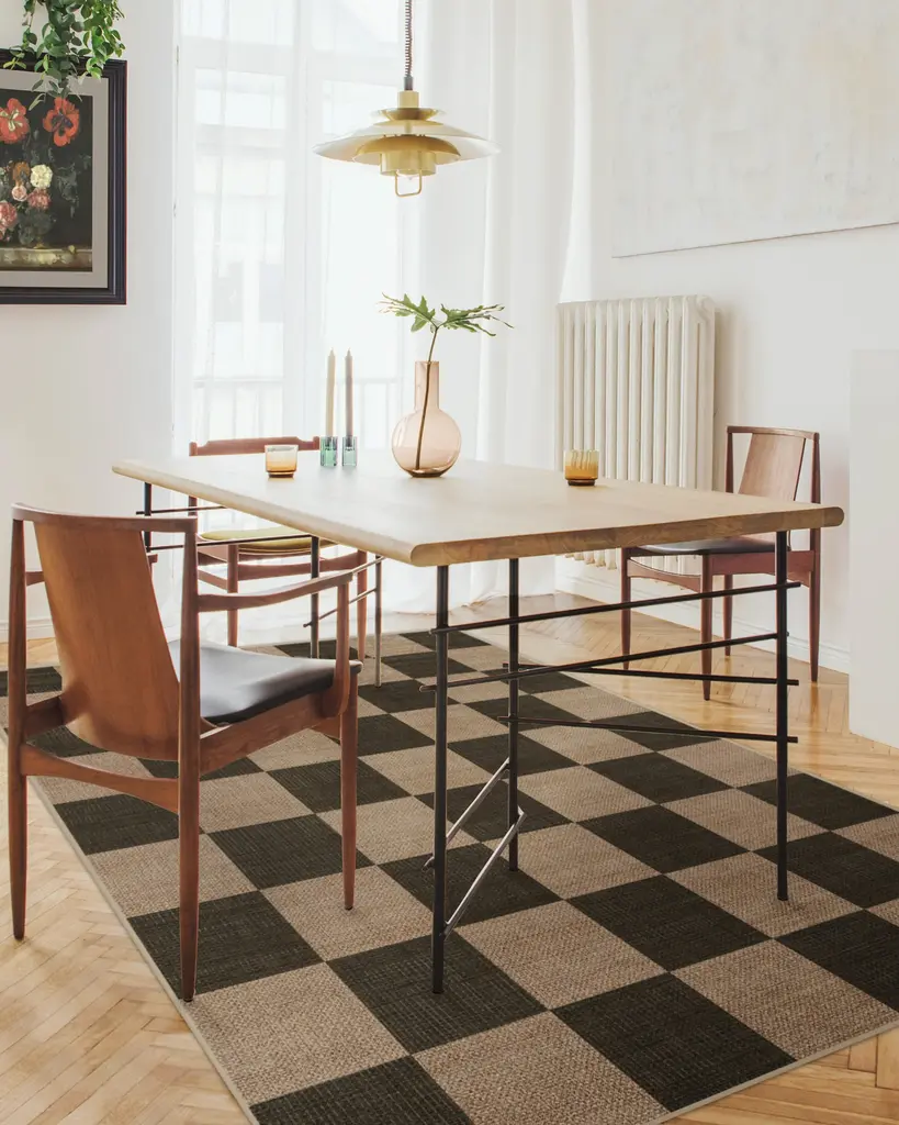 A classic pattern that's sure to turn heads every time. Our Checkerboard Soft Black Re-Jute Rug features a bold geometric pattern in weathered black on a warm beige background that gives off the regal ambience of vintage Italian flooring. The woven jute-like material is made from recycled and virgin polyester, and polyurethane that won't shed or fray. Water-resistant, stain-resistant, and machine-washable.