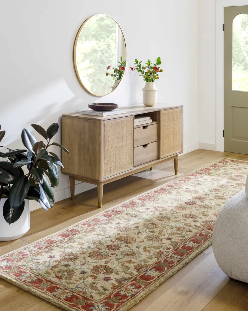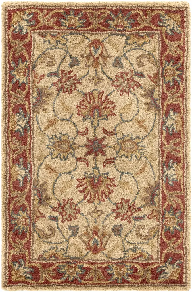 Collection: Dresher Colors: Olive, Navy, Tan, Rust, Dark Brown Construction: Hand Tufted Material: 100% Wool Pile: Medium Pile Pile Height: 0.39" Styles: Traditional Backing: Canvas Made In: India Thickness: 0.87" Price Range: $$$$$ (Affordable)