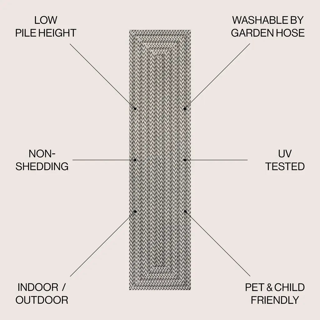 Add modern style to your mid-century bungalow, beach cottage or farmhouse with our unique geometric rug. This durable low pile rug features concentric squares woven in a graphic chevron pattern. This pet-friendly rug will add punch to your living room, dining room, bedroom, or porch.