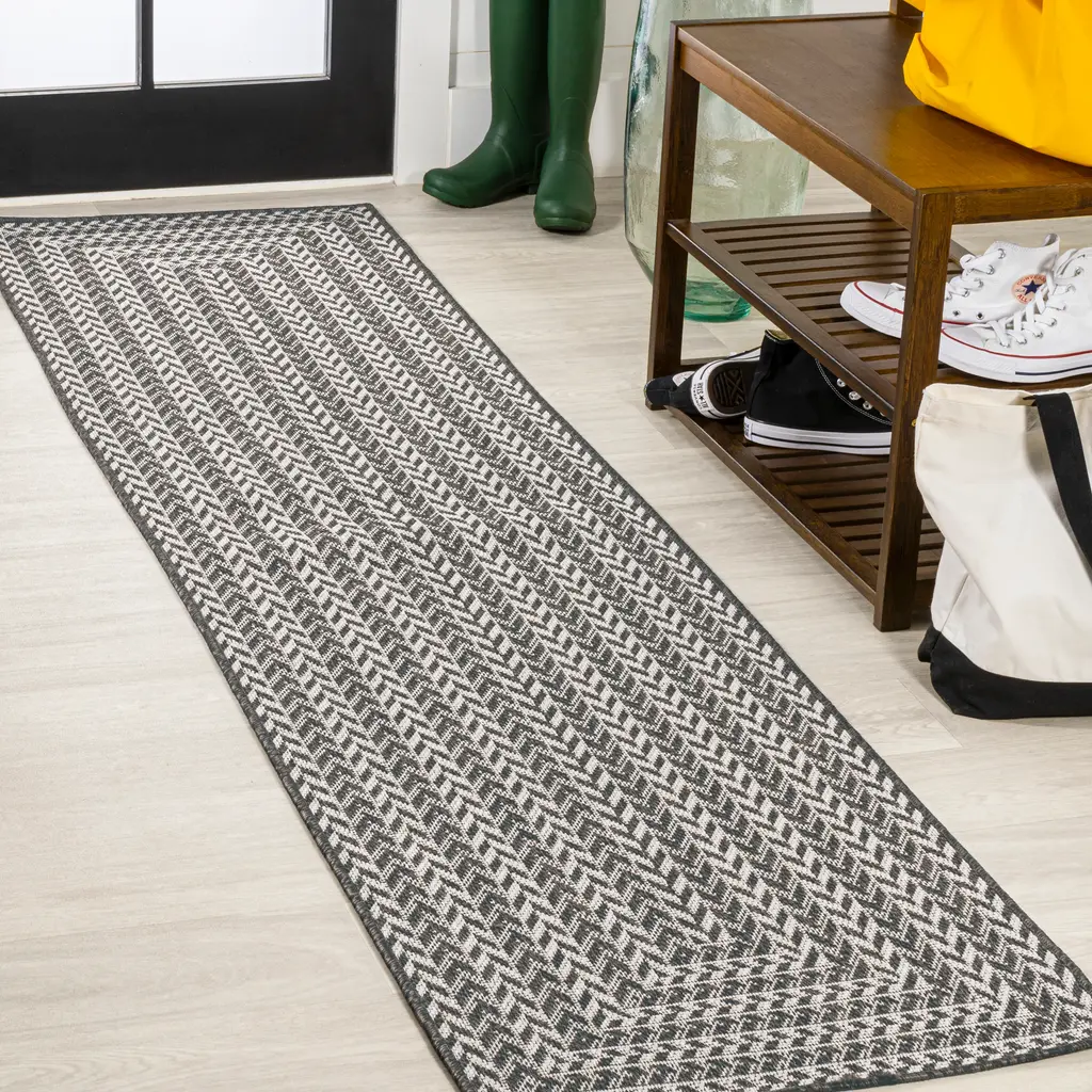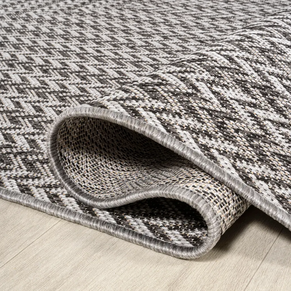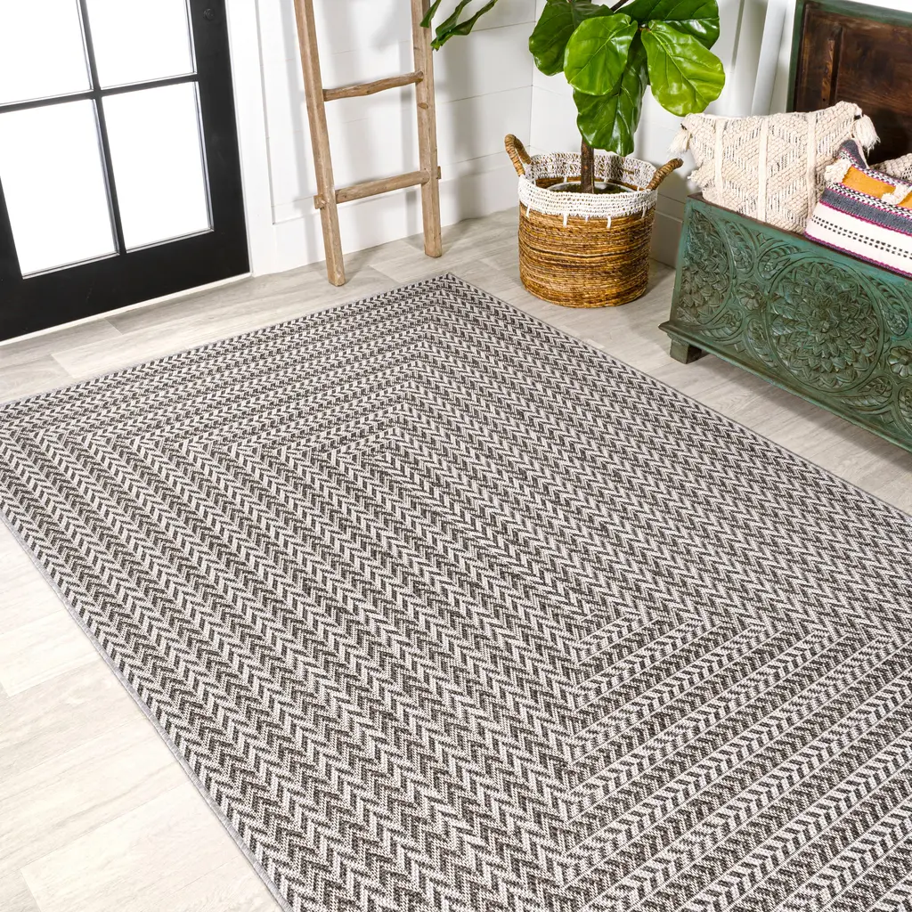 Add modern style to your mid-century bungalow, beach cottage or farmhouse with our unique geometric rug. This durable low pile rug features concentric squares woven in a graphic chevron pattern. This pet-friendly rug will add punch to your living room, dining room, bedroom, or porch.