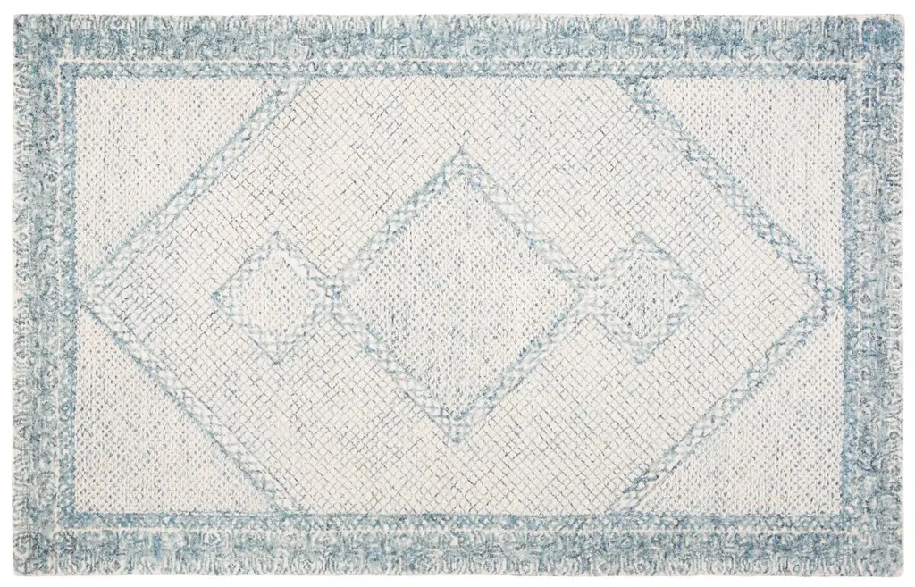Elevate your space with this exquisite 5' x 8' Ivory/Blue Bohemian-style area rug. Hand-tufted in India, this woolen masterpiece boasts a plush 3/8" pile height and showcases a medium rectangle shape that's perfect for various room layouts. Its enchanting pattern, featuring diamond motifs enveloped by intricate border detailing, adds a touch of timeless elegance to any interior. Though not washable and without slip-resistant features, its craftsmanship guarantees both beauty and durability? a truly luxurious addition to your decor collection.