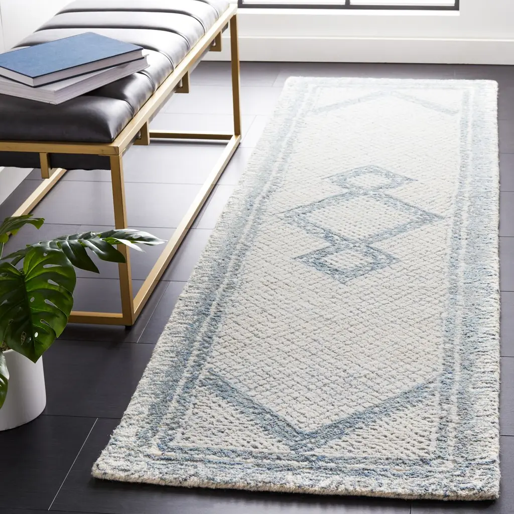 Elevate your space with this exquisite 5' x 8' Ivory/Blue Bohemian-style area rug. Hand-tufted in India, this woolen masterpiece boasts a plush 3/8" pile height and showcases a medium rectangle shape that's perfect for various room layouts. Its enchanting pattern, featuring diamond motifs enveloped by intricate border detailing, adds a touch of timeless elegance to any interior. Though not washable and without slip-resistant features, its craftsmanship guarantees both beauty and durability? a truly luxurious addition to your decor collection.