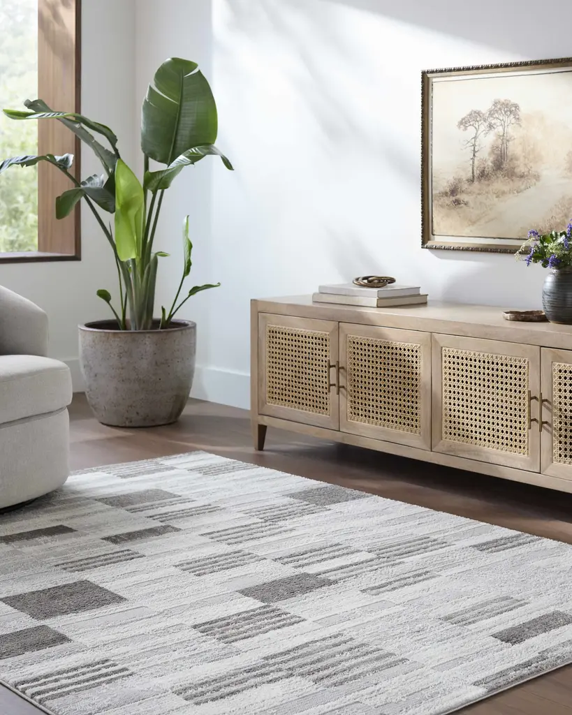 Collection: Chiaki Colors: Ivory, Light Gray, Medium Gray, Silver Gray Construction: Machine Woven Material: Face: 100% Polyester Pile: Medium Pile Pile Height: 0.39" Styles: Contemporary Made In: Turkey Thickness: 0.43" Price Range: $$$$$ (Most Affordable)