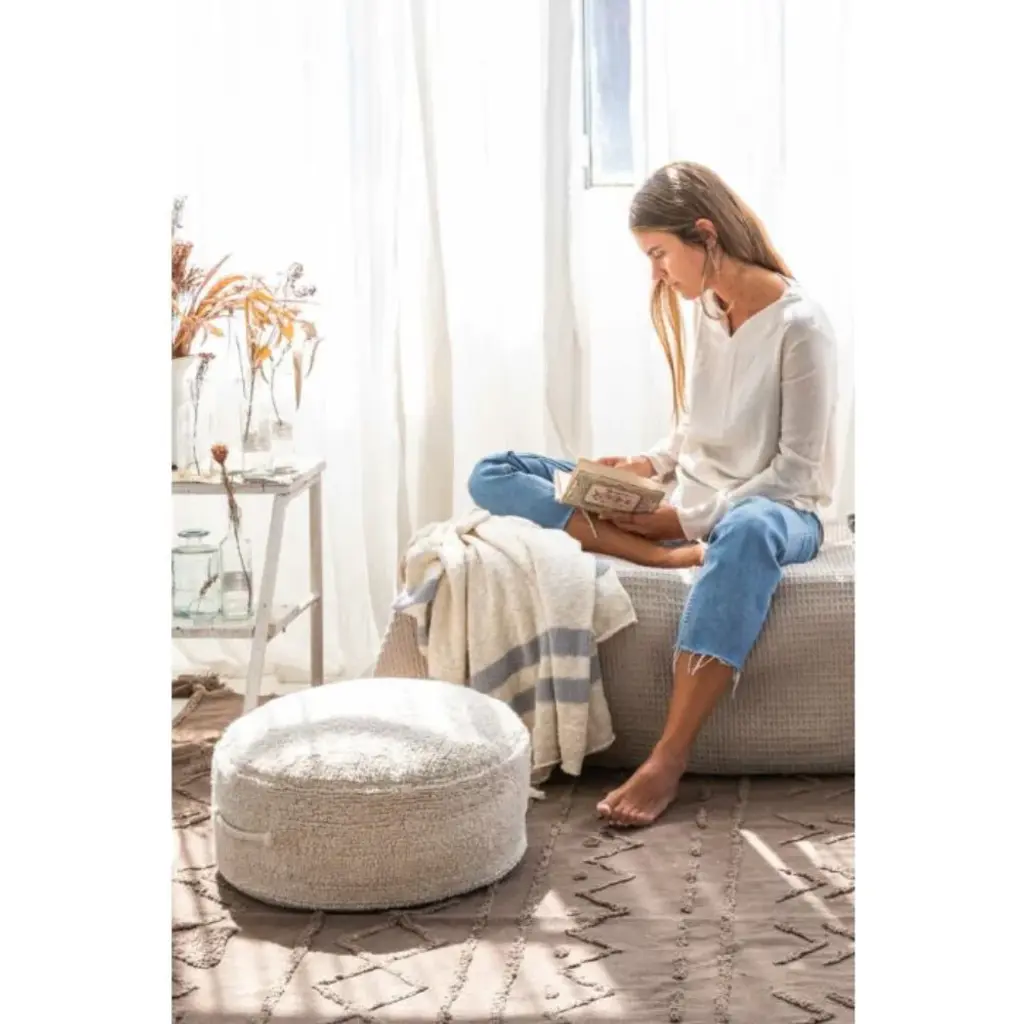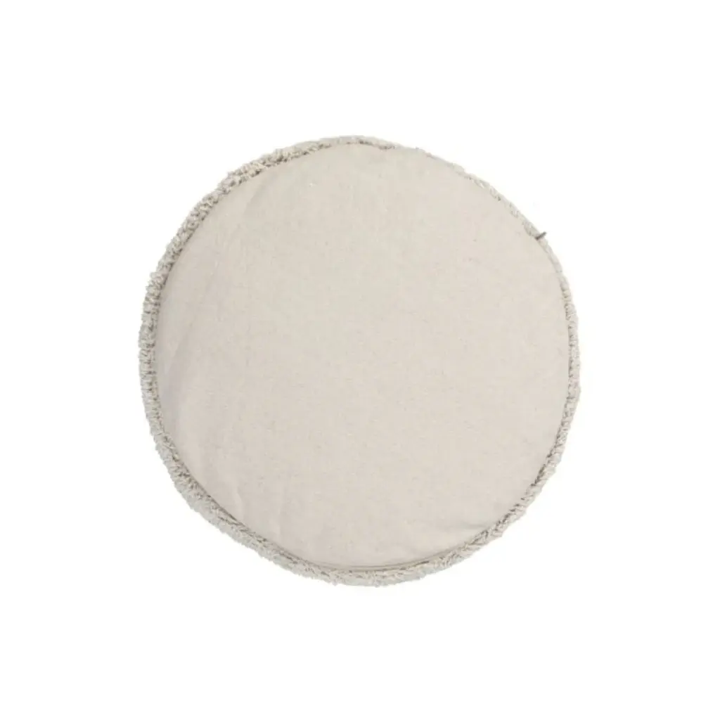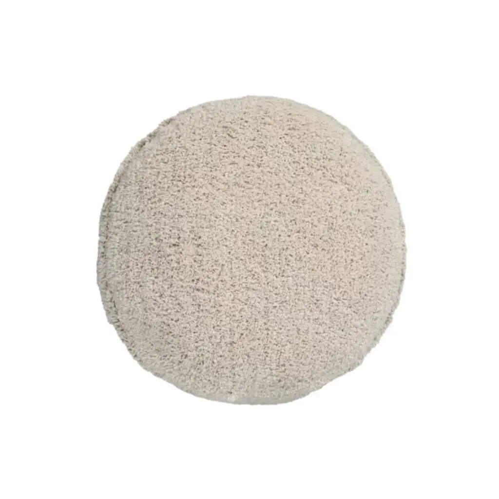 Add a cozy touch to your little one's nursery or playroom with this sweet + washable wool rug. Its soft long pile + recycled cotton canvas base make it both comfortable and durable. The rounded edges and imitate the silhouette of sheep hide, finished in beige.
