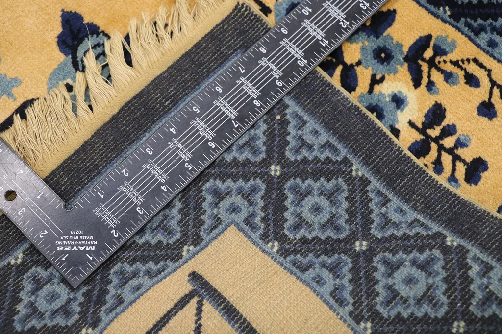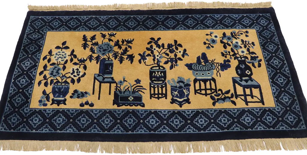 This hand-knotted wool vintage Chinese Baotou pictorial rug features an abrashed tan field showcasing different types of cloisonné vases sprouting with stylized florals resting on pedestals symbolizing peace and tranquility. It is enclosed with a geometric border. With its depth of meaning, fine attention to detail, and glorious composition, this vintage Chinese Baotou rug would bring a touch of Jazz Age splendor to any interior.