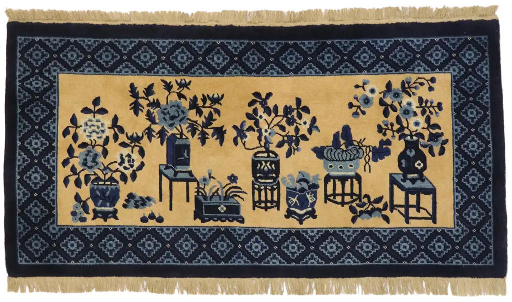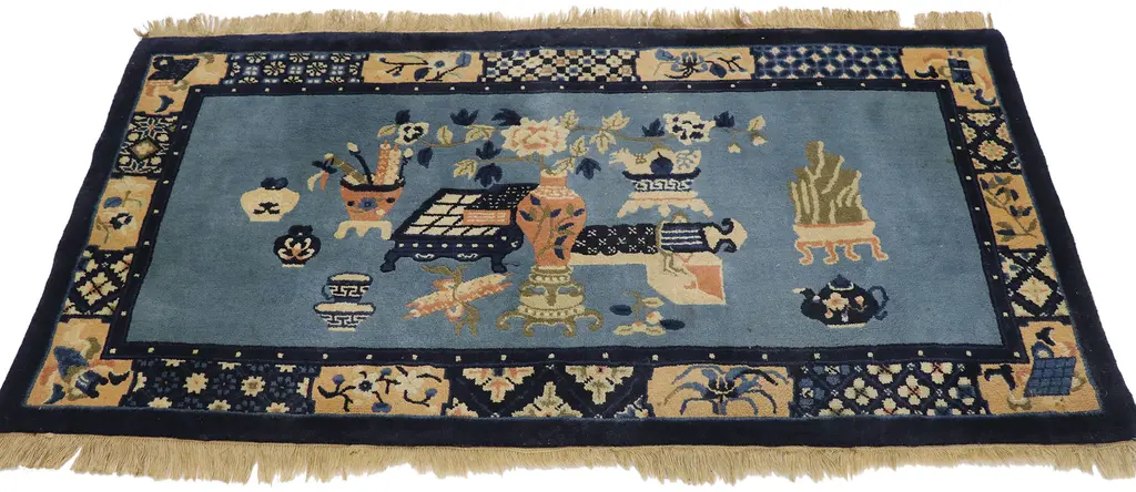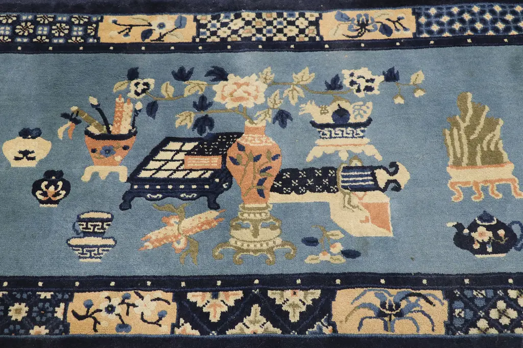 This hand-knotted wool antique Chinese Baotou rug features a variety of scholarly objects arranged in a still life design. The objects on display are firmly rooted in the philosophies of Confucianism, which prizes scholarship and self-cultivation as a means of attaining harmony on earth and an idyllic society. The four main symbols of Confucianism are the harp, chessboard, books, and scrolls, all of which are featured prominently in this piece.