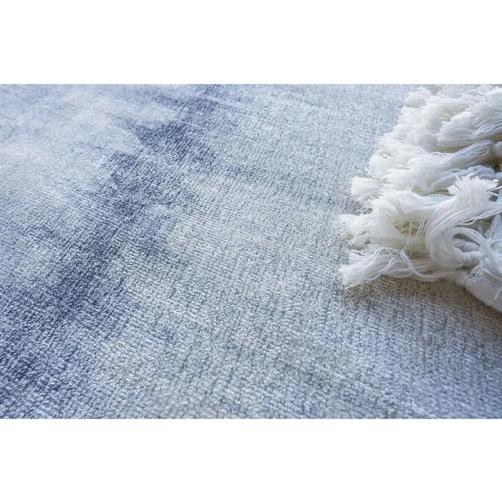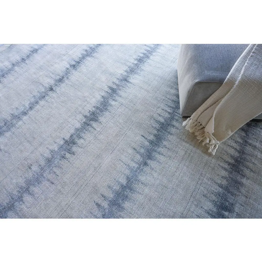 Rug swatch available! To order, choose SAMPLE in the size drop-down.With a serene palette and artful design, the 12’x15’ Chloe rug makes a lively addition to a living room, bedroom, or dining room. Hand-loomed with wool and bamboo silk in shades of blue, a repeating geometric wave pattern is the highlight of this dreamy designer rug.