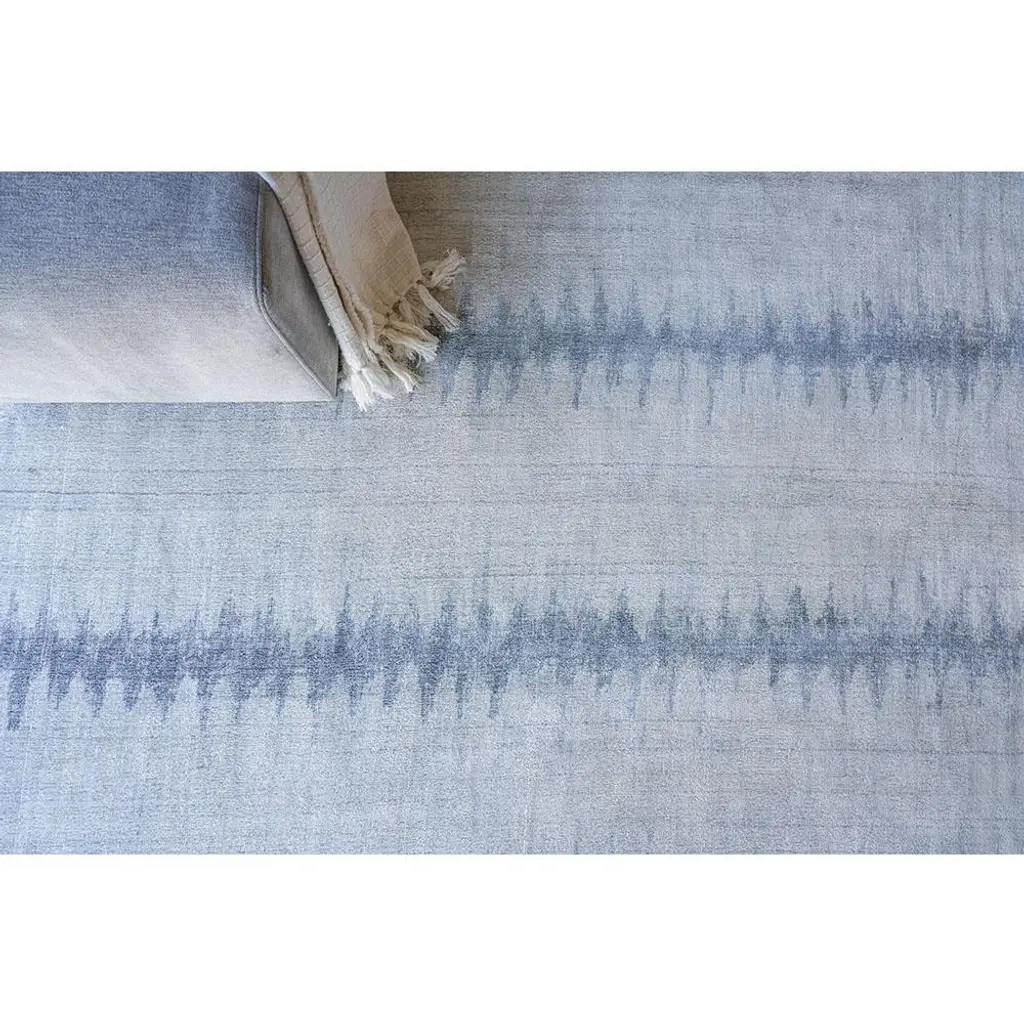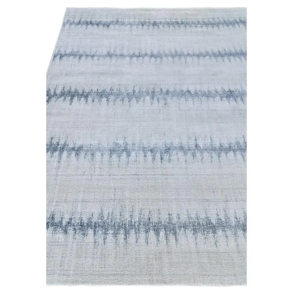 Rug swatch available! To order, choose SAMPLE in the size drop-down.With a serene palette and artful design, the 6’x9’ Chloe rug makes a lively addition to a living room, bedroom, or dining room. Hand-loomed with wool and bamboo silk in shades of blue, a repeating geometric wave pattern is the highlight of this dreamy designer rug.