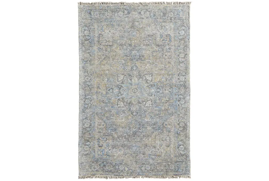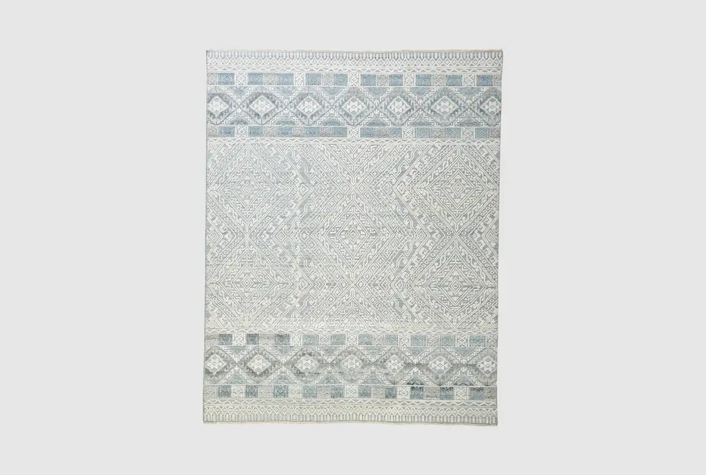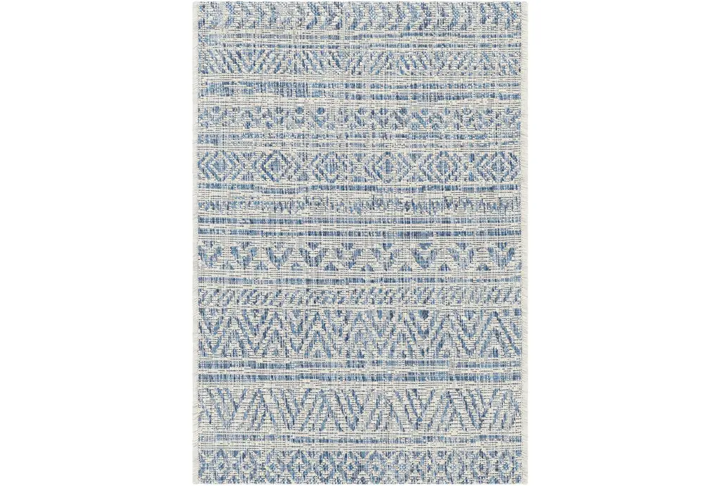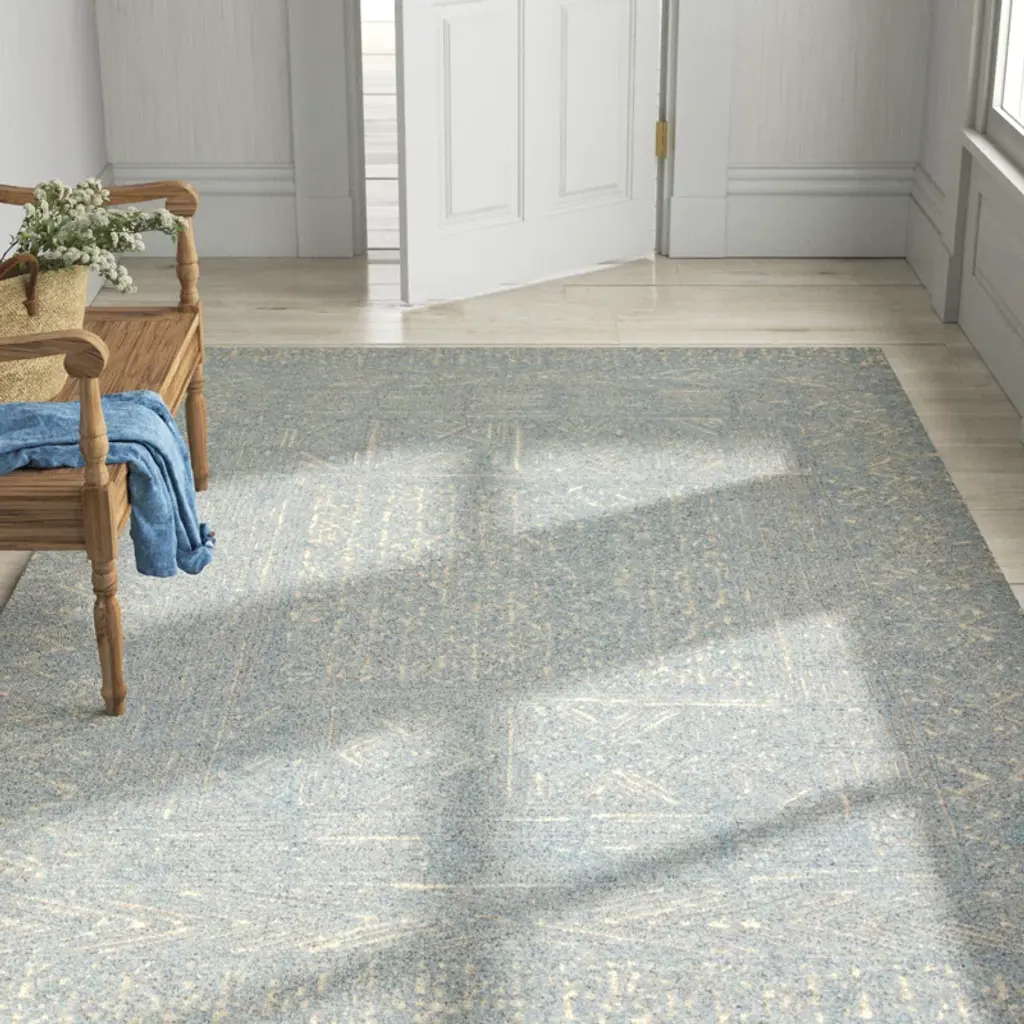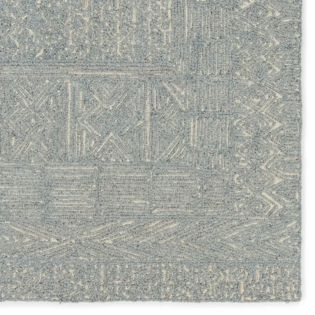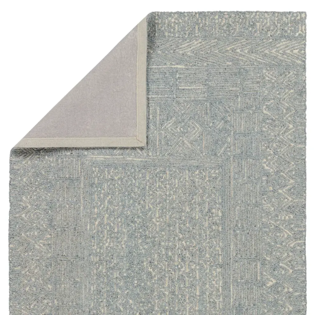 This hand-tufted area rug combines intricate, African, and Moroccan designs with a modern color palate. The blue and cream looped pile creates a striped and geometric design of varying heights. The wool pile creates texture and dimension that delights in medium and low trafficked spaces of the home such as bedrooms, formal living rooms, dining spaces, and sitting rooms.