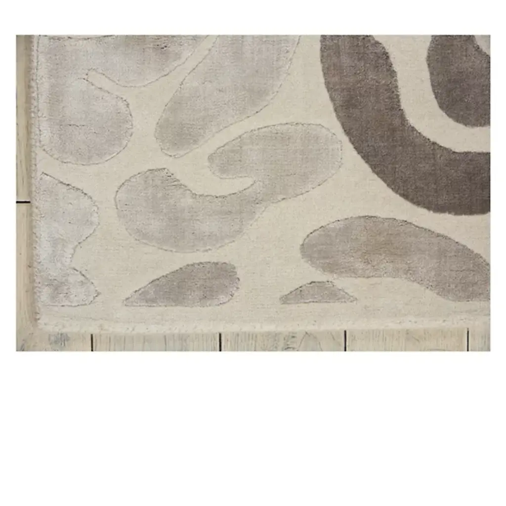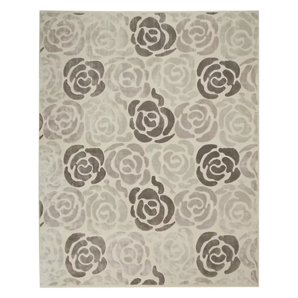The Christopher Guy CGS20 Area Rug from Nourison Home presents an intriguing, artistic presentation that implies a vintage design, though the tight, hand-knotted weave of New Zealand wool and silk feels freshly crafted by the Indian artisans who make it. The stylized repeating floral pattern shifts through faded and bold gradients, placing a playful contrast atop the rug’s soft surface.