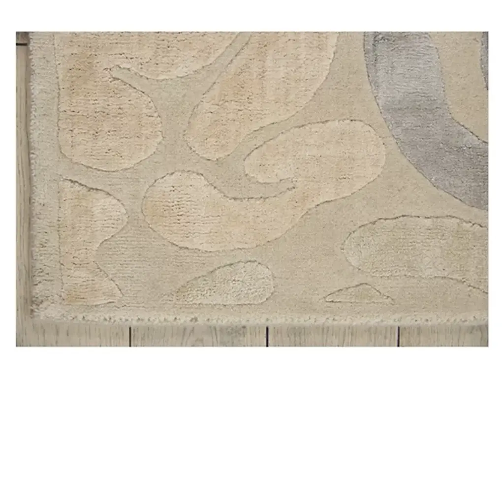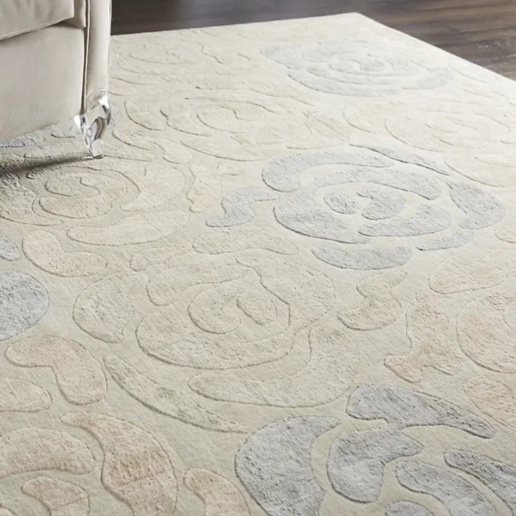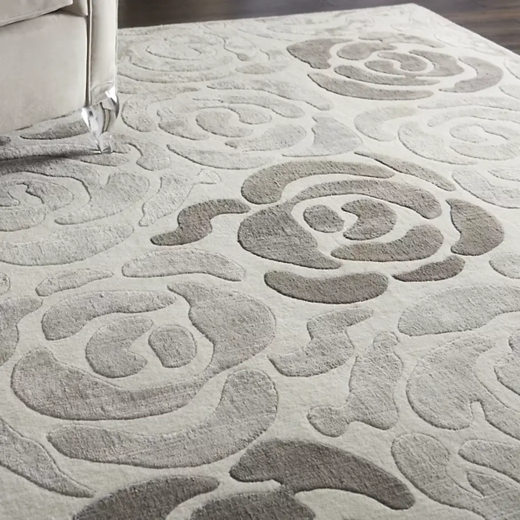 The Christopher Guy CGS20 Area Rug from Nourison Home presents an intriguing, artistic presentation that implies a vintage design, though the tight, hand-knotted weave of New Zealand wool and silk feels freshly crafted by the Indian artisans who make it. The stylized repeating floral pattern shifts through faded and bold gradients, placing a playful contrast atop the rug’s soft surface.