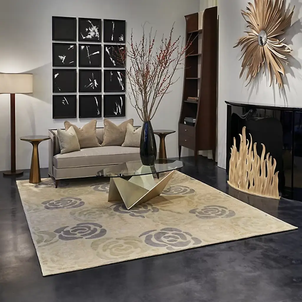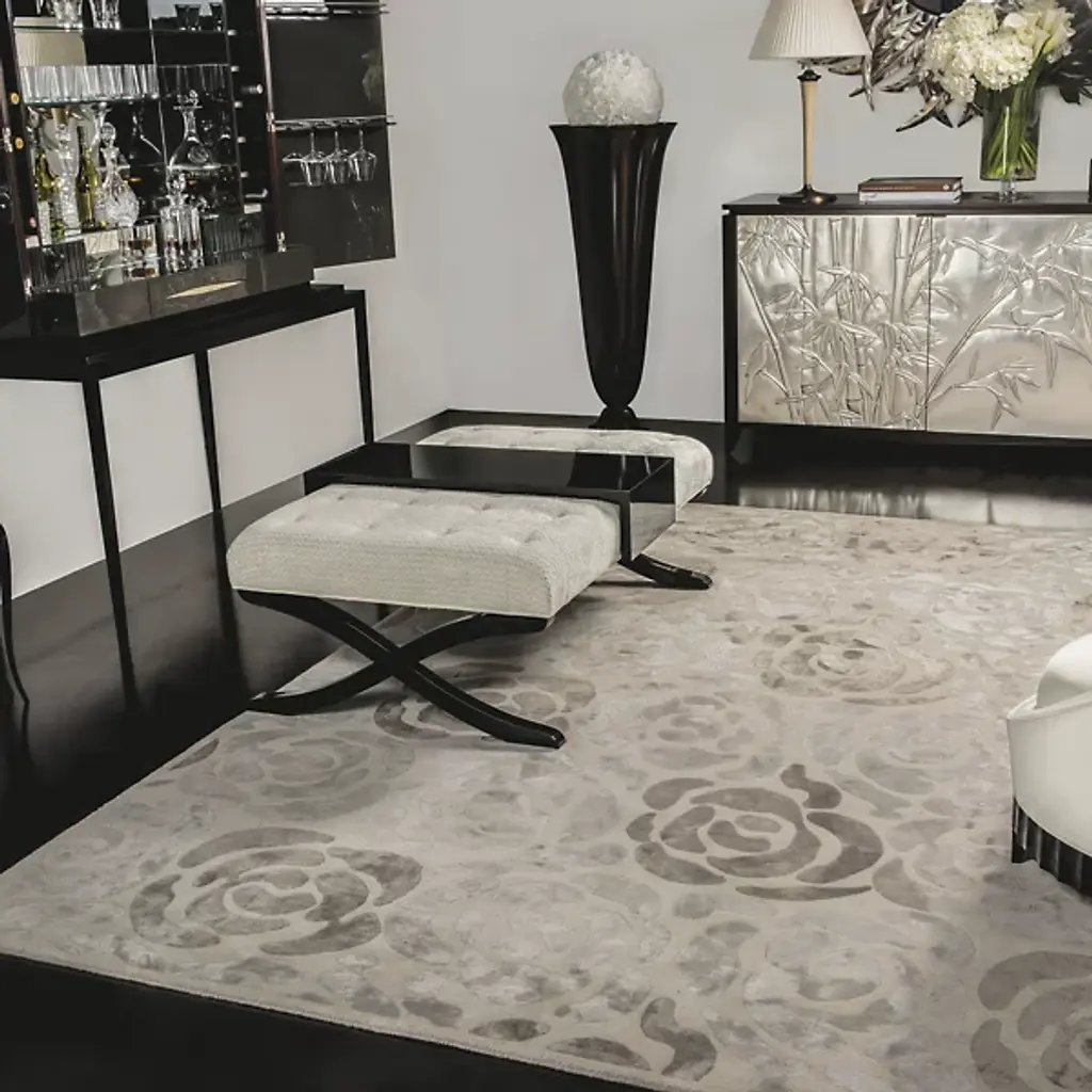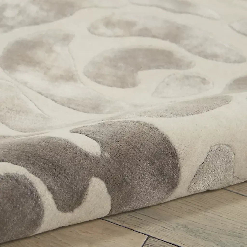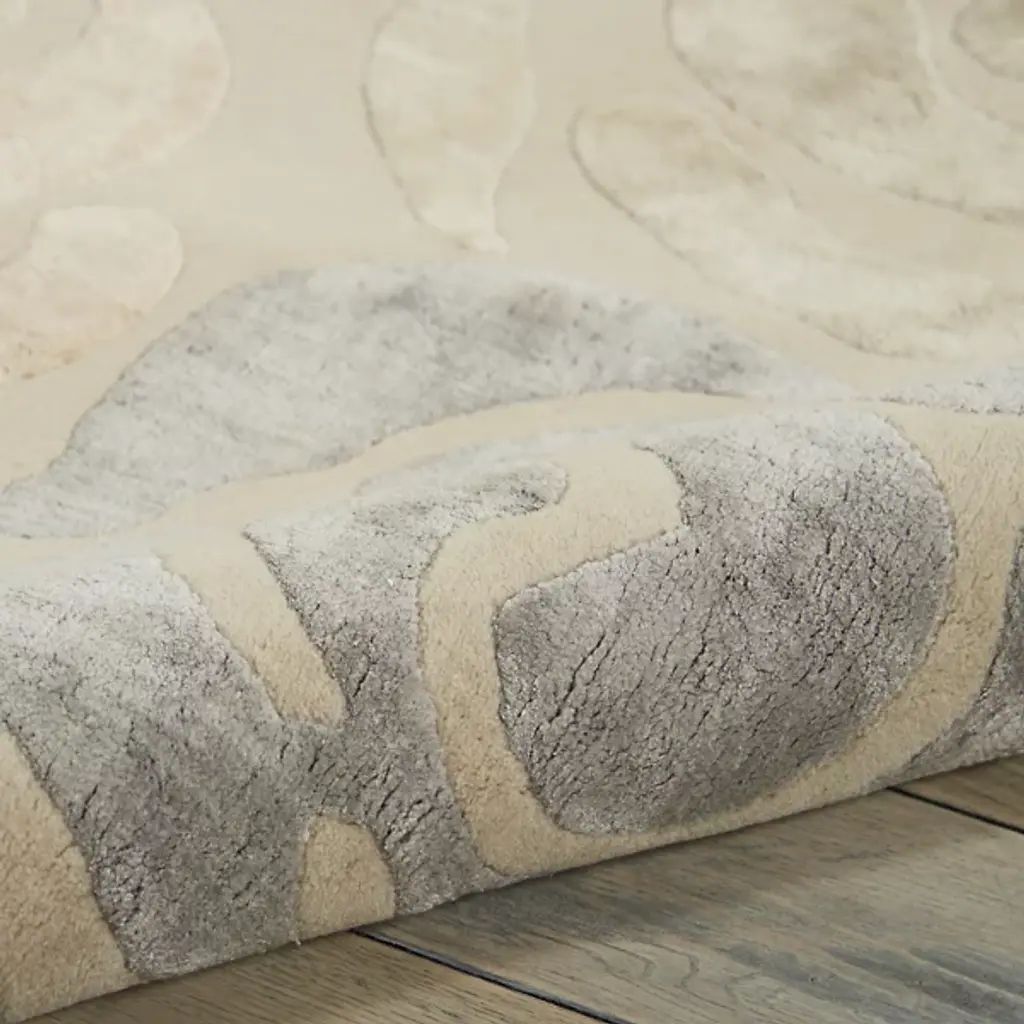 The Christopher Guy CGS20 Area Rug from Nourison Home presents an intriguing, artistic presentation that implies a vintage design, though the tight, hand-knotted weave of New Zealand wool and silk feels freshly crafted by the Indian artisans who make it. The stylized repeating floral pattern shifts through faded and bold gradients, placing a playful contrast atop the rug’s soft surface.