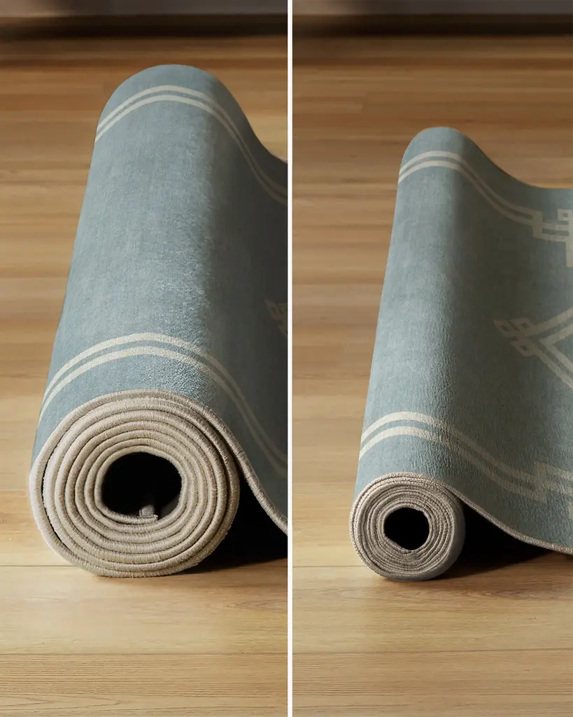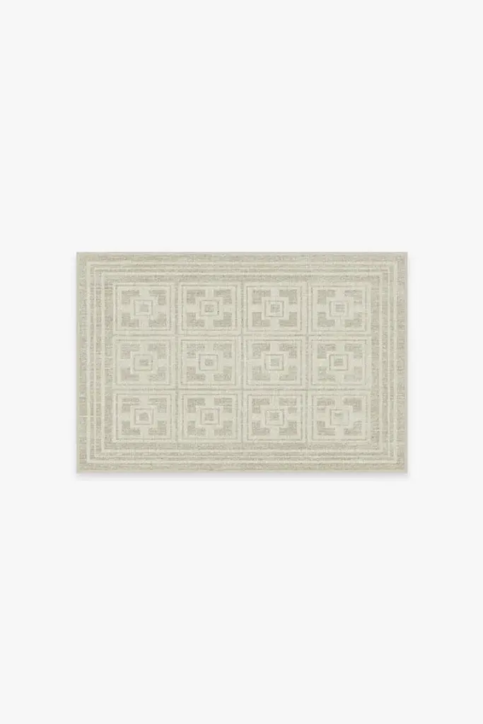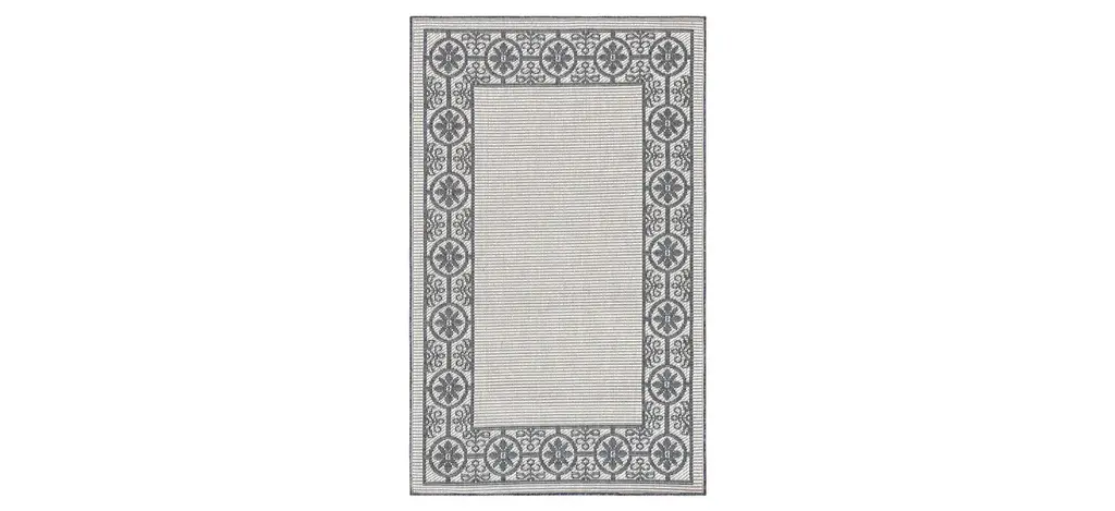 Elevate the everyday with The Hiltons Chrysler Border Chambray Blue Rug. Inspired by the iconic architecture of the Art Deco era, this glamorous design features bold, geometric column-like structures. The Eastern-inspired, light cream corner motifs add grandeur and classic charm against the lovely, powder blue background. Water-resistant, stain-resistant, and machine-washable. Rug colors may vary slightly according to your device and the lighting in your space.