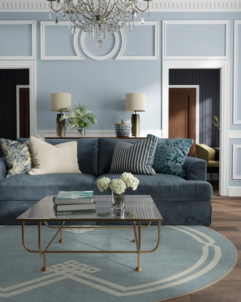 Elevate the everyday with The Hiltons Chrysler Border Chambray Blue Rug. Inspired by the iconic architecture of the Art Deco era, this glamorous design features bold, geometric column-like structures. The Eastern-inspired, light cream corner motifs add grandeur and classic charm against the lovely, powder blue background. Water-resistant, stain-resistant, and machine-washable. Rug colors may vary slightly according to your device and the lighting in your space.