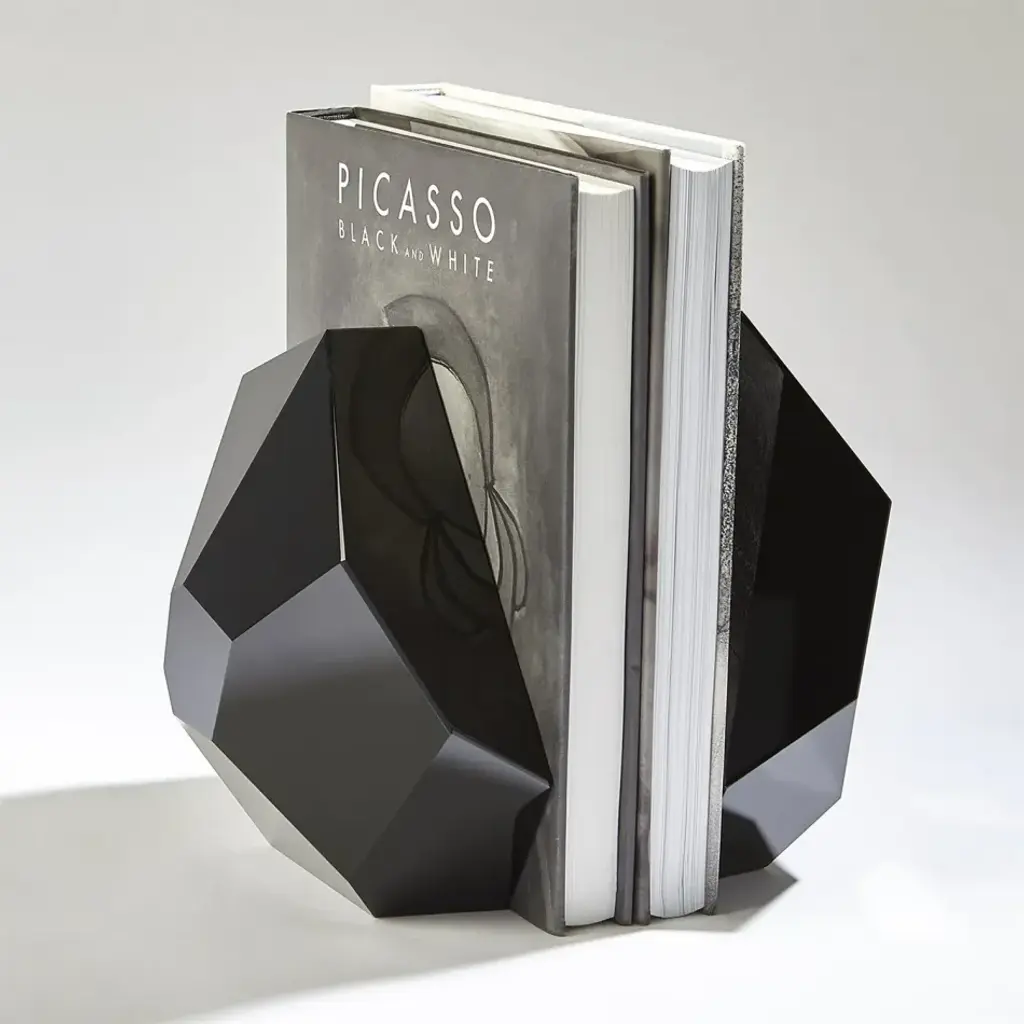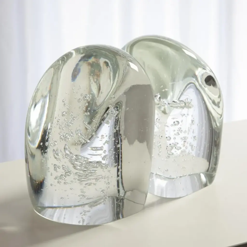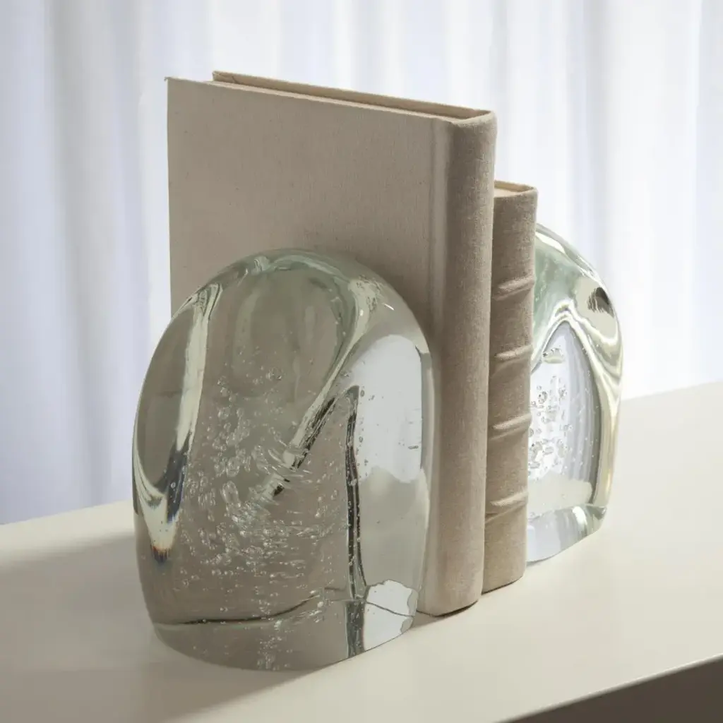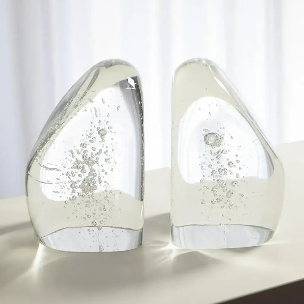 Thick clear art glass is blown by Polish artisans; each will be individually unique. These book ends feature clear bubbles. From a fashion forward perspective, Global Views offers accessories, furniture, statement lighting, and an assortment of rugs and mirrors to add beauty and joy to your home.