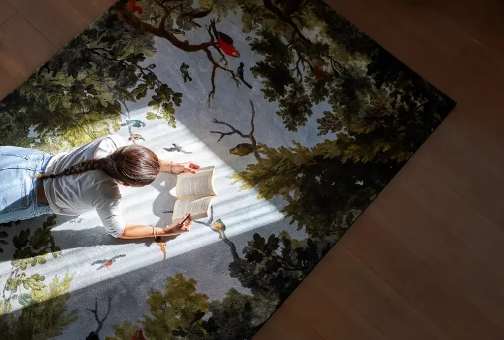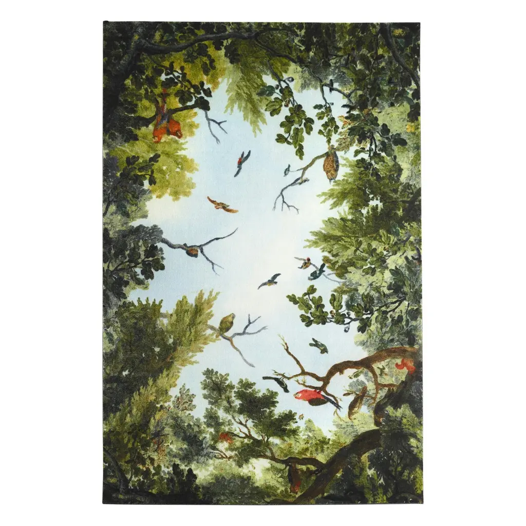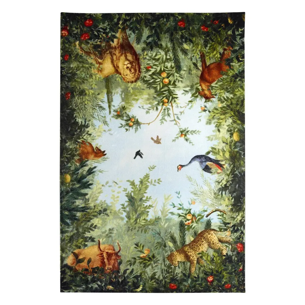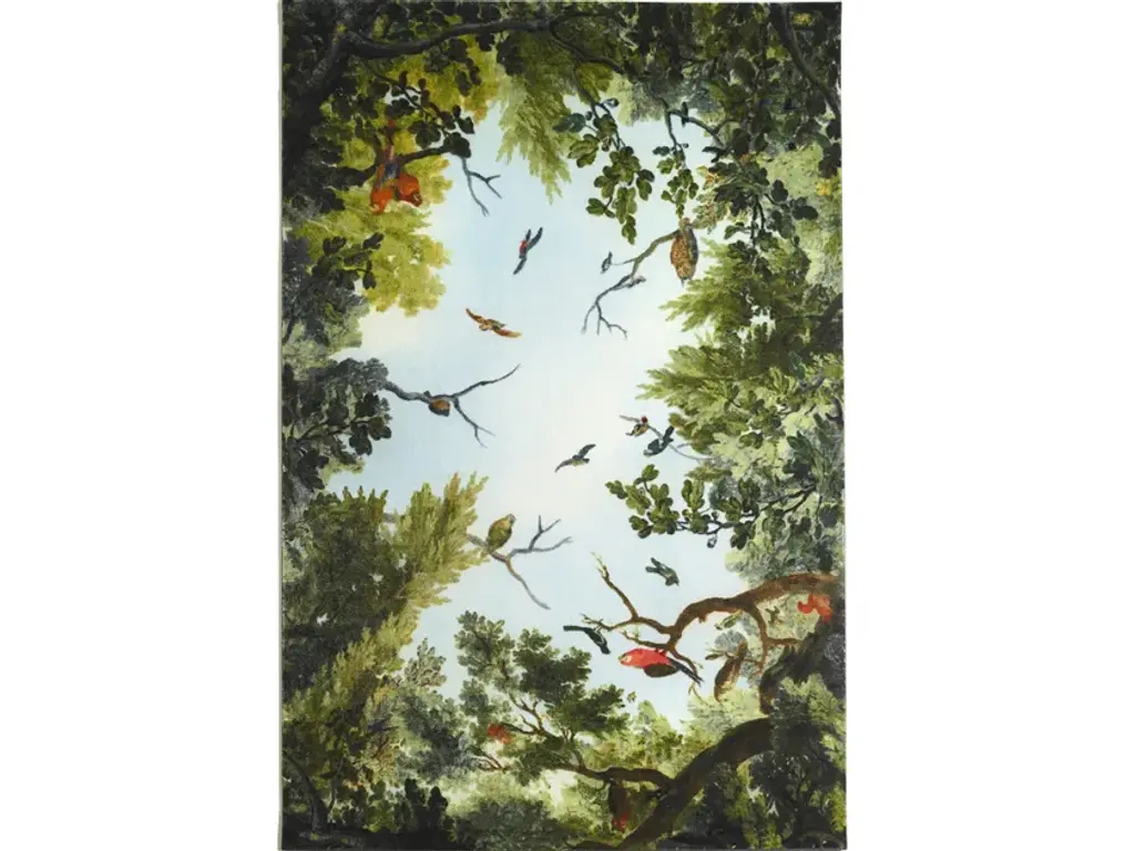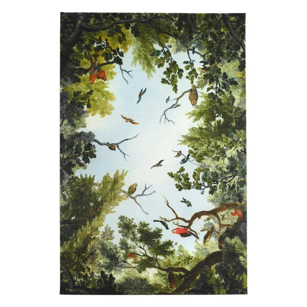 A blue sky surrounded by the green foliage of trees on which colourful birds lay down. An overturned sky that according to the intentions of the designer Marcantonio helps us to always bear in mind our deep and eternal bond with nature. Because what we see today if we only look upwards is similar to what our fathers of even farther ages saw. It is a naturalistic scenario that has been re-proposed not by chance in the typical manner of Renaissance frescoes, a time period in which, for the first time, nature is conceived as a living whole, intimately linked with mankind. Available in two sizes, Cielo is the perfect rug for those who year-round dream about the clear air of spring afternoons. Made of synthetic fibre, it has a webbing edge and a felt back which protects the surfaces and guarantees maximum stability.The collection is completed by the Terra carpet representing a natural environment populated by wild animals.Four-colours printed synthetic fibre carpet representing a view of the sky and the animals that live in it. Felt backing and webbing edges. Available in two rectangular sizes. Notes: home and contract use. Fireproof and anti-slip. Good sound insulation.