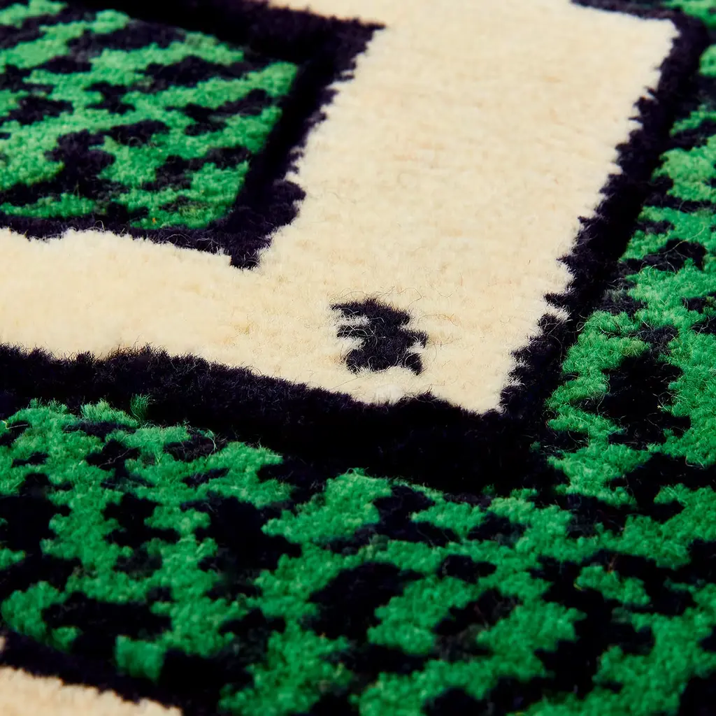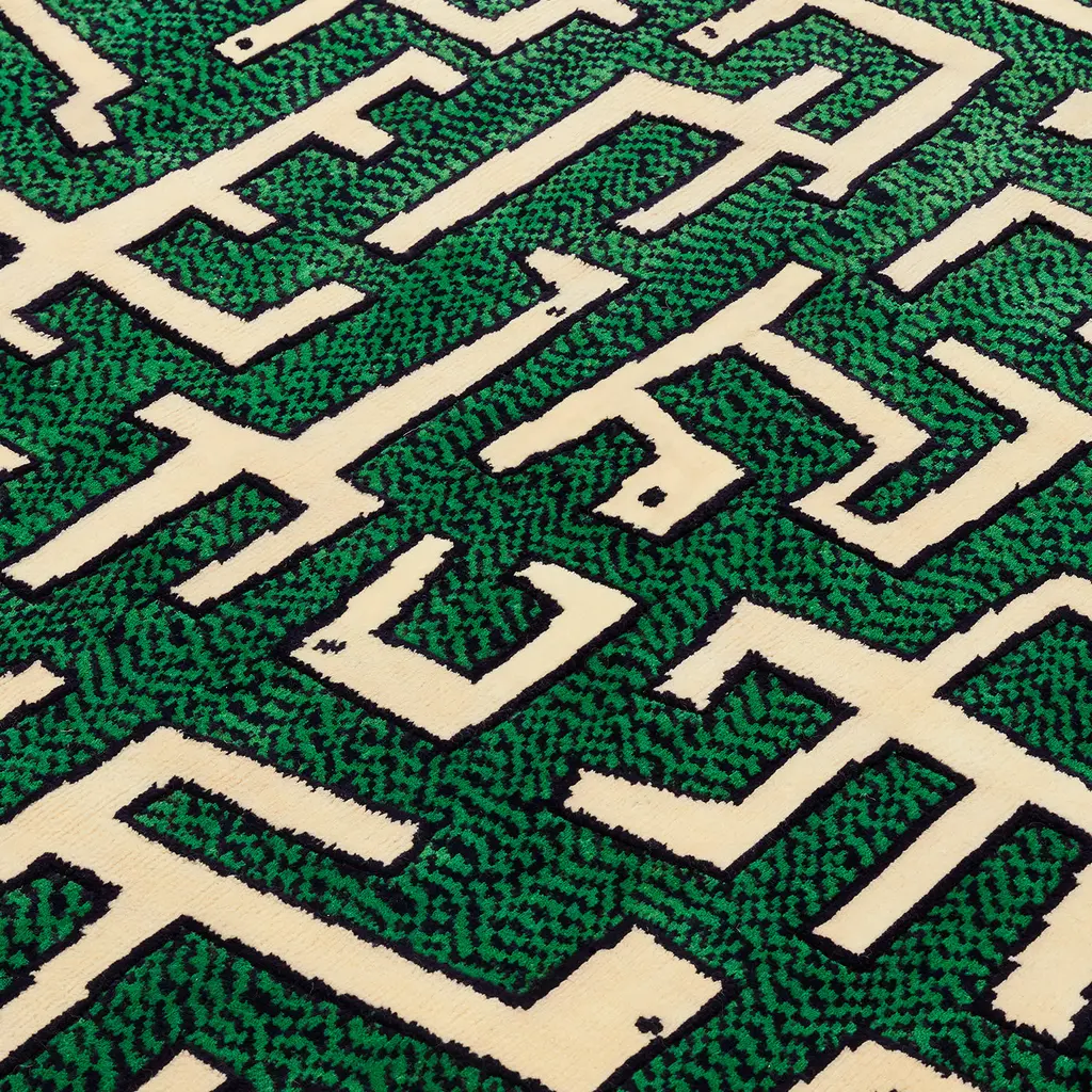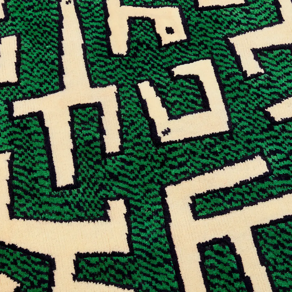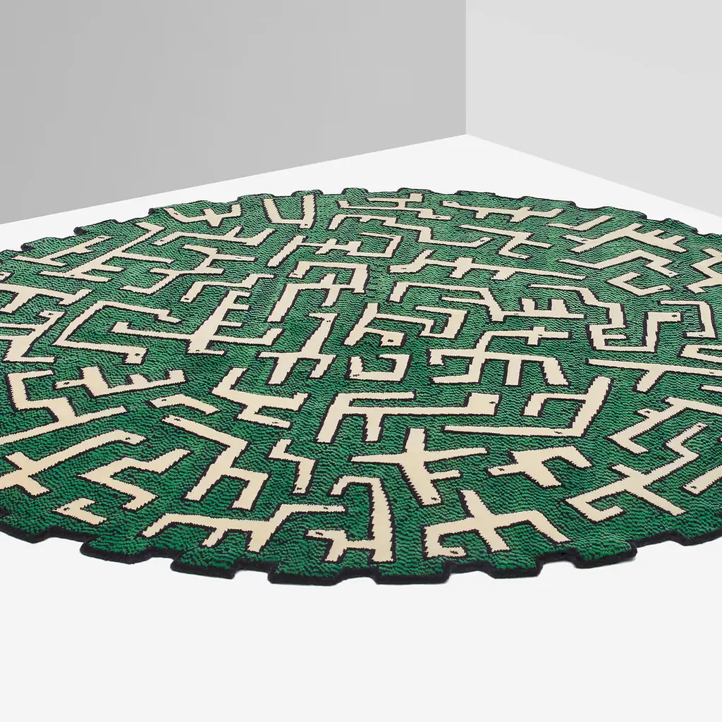 Crafted by master artisans in India, this superb hand-knotted rug is defined by a striking and unconventional profile: the circular rug has a geometric edge and a series of yellow geometric lines set on a green background. This exclusive design by Maarten Baas (2015) is crafted of wool and features 40 knots per inch and a 10mm-high pile. Customizable in any size, please ask the Concierge for details and pricing in the selected options.