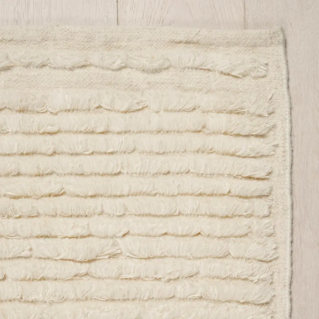 Our Cirrus Rug is a simple wool flatweave made fabulous by furry rows of fringe-like cotton-linen tufting. An understated statement piece, this unique rug adds luxurious texture to any room.