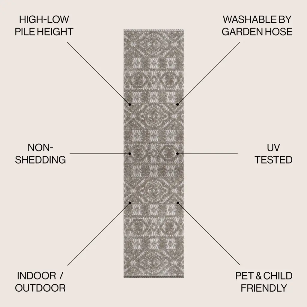 Inspired by Mediterranean tile designs, our classic rug is power-loomed with a short pile. The ornate geometric pattern is woven on a field of ivory; the all-over design is perfect for a living room, dining room, kitchen, bedroom or entry. Add some Old World Spanish flair to your home with this easy-care rug.Features:Power loomed with a 0.31" pile that''s soft and durableThe dark gray and ivory color scheme is a modern take on neutral, graphic Moroccan rugsMade from easy-care polypropylene - just sweep, vacuum or hose down with mild soap and water100% PolypropyleneNo backing, use of rug pad is recommended (sold separately)Power Loomed in TurkiyeActual Dimension: 2 ft x 8 ft.Color: Dark Gray/IvoryThickness measures: 0.31 in.Available in multiple sizes and/or colorsRug Care:Vacuum regularly and spot clean as needed; avoid direct and continuous exposure to sunlight; use brushless vacuum; remove spills immediately; if liquid, blot with clean, undyed cloth by pressing firmly around the spill to absorb as much as possible; for hard to remove stains, professional rug cleaning is recommended; store in a dry, well ventilated area and rotate for consistent wearPacking and shipping may cause temporary creases in rugs, which will flatten out after a week on the floor; to expedite the process, try back-rolling your rug before laying it down, and then allow ample time for the remaining creases to relaxPlease Note: Due to differences in monitors, some rug colors may vary slightly. Lengths and widths may vary from the published dimensions. Patterns may vary slightly according to shape and size selected.About us:Style your floors with JONATHAN Y. By combining fine craftsmanship and design, this New York creative studio is bringing fashion to your floors. The collection mixes sustainable organic materials, vibrant colors and trend worthy styles to create JONATHAN Y''s distinctive catalog of rugs.