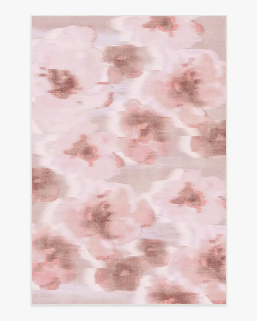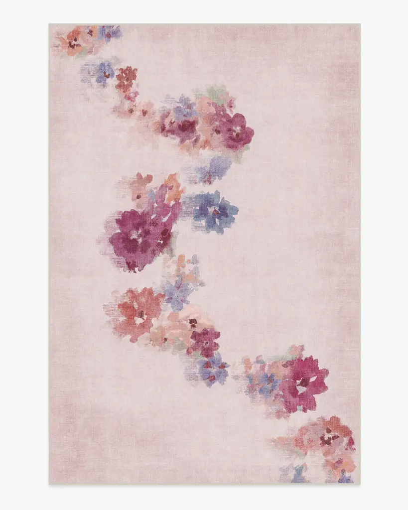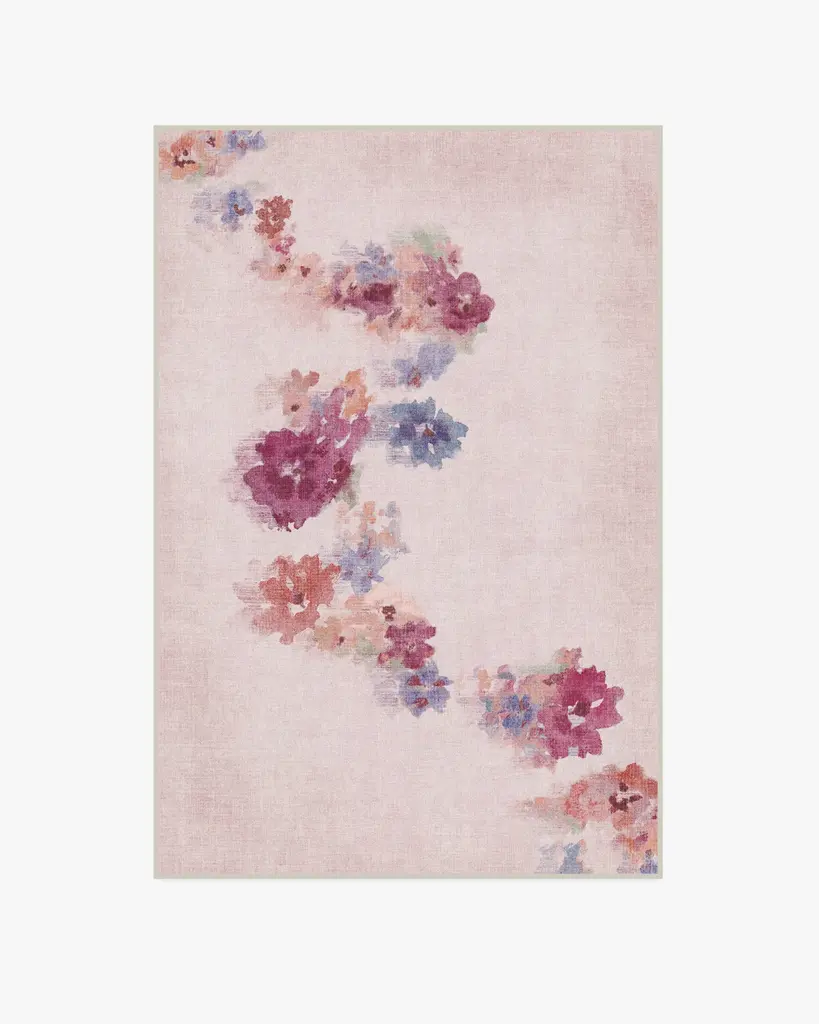 Inspired by the dreamlike beauty of blooming flowers, our Clara Soft Rose Rug design features an impressionistic watercolor effect, where soft floral shapes flow from north to south. The soft mauve pink background is delicately complemented by floral pops of lavender, light coral, and light burgundy. Water-resistant, stain-resistant, and machine-washable. Rug colors may vary slightly according to your device and the lighting in your space.