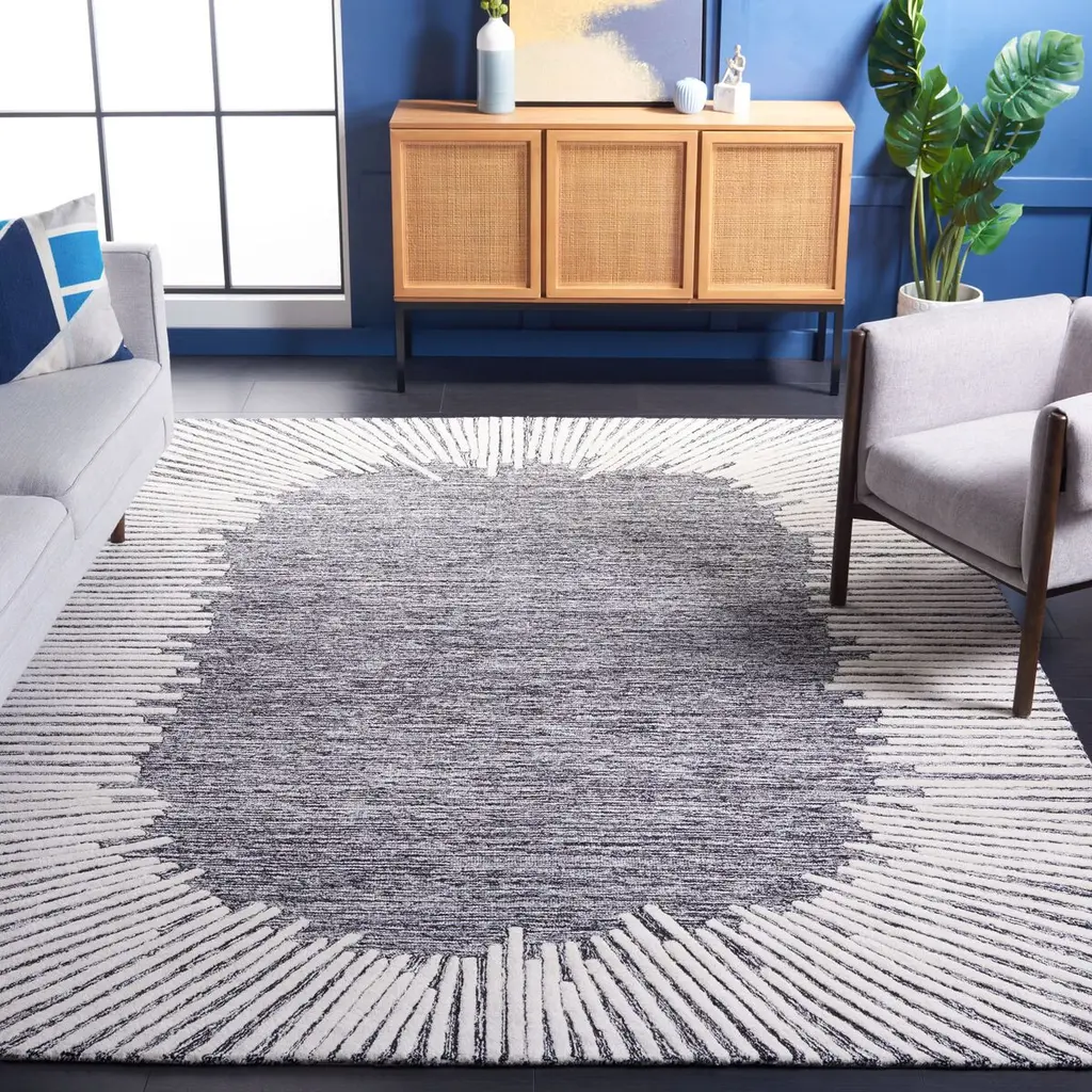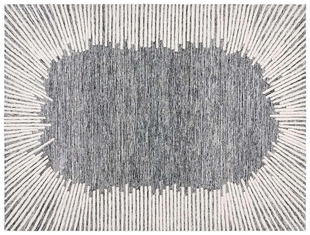 Introducing our exclusive 3' X 5' contemporary area rug, a striking blend of BLACK / IVORY that anchors any room with its sophisticated charm. This small rectangle-shaped rug boasts a hand-tufted construction, meticulously crafted with 85% Wool and 15% Cotton for enduring quality and a comfortable underfoot feel. Fashioned by artisans in India, the rug features a plush 1/2" pile height, offering a luxurious texture that invites you to step into a world of comfort. Its modern design, showcasing dynamic, abstract streaks that create an illustrious radiance, complements a range of interiors, elevating your living space with its artful appearance. While this rug is not washable, its high-quality materials ensure lasting use with proper care. Please note that it is not slip-resistant, so a rug pad is recommended for stability. Transform your home with this hand-tufted masterpiece, designed to impress and endure.