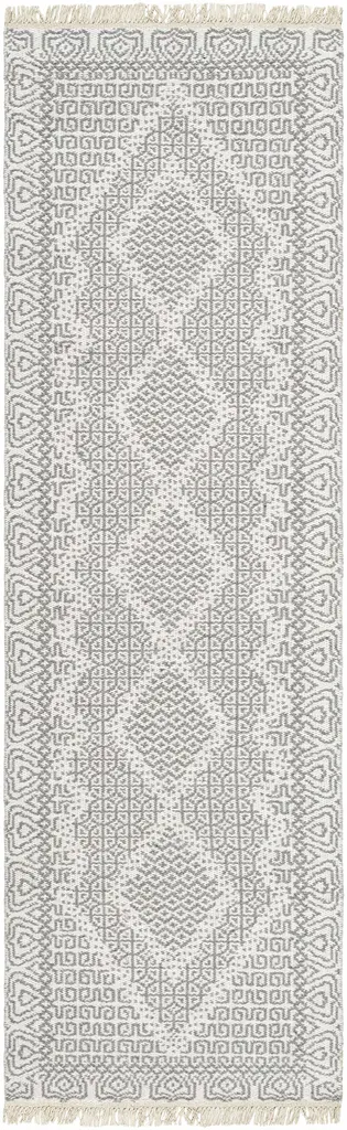 Collection: Claus Colors: Beige, Gray Construction: Hand Woven Material: 100% Wool Pile: No Pile Styles: Transitional,Traditional Made In: India Thickness: 0.4" Fringe Length: 2" Price Range: $$$$$ (Affordable)