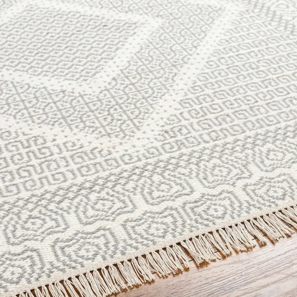 Collection: Claus Colors: Beige, Gray Construction: Hand Woven Material: 100% Wool Pile: No Pile Styles: Transitional,Traditional Made In: India Thickness: 0.4" Fringe Length: 2" Price Range: $$$$$ (Affordable)