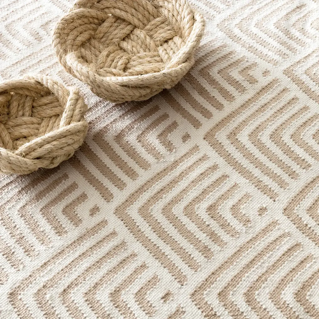 A traditional kilim weave gets the indoor/outdoor treatment in eco-friendly recycled materials and a woof-worthy graphic pattern in classic ivory and a single gorgeous color. Variations in color are expected.Made of 100% PET, a polyester fiber made from recycled plastic bottles.