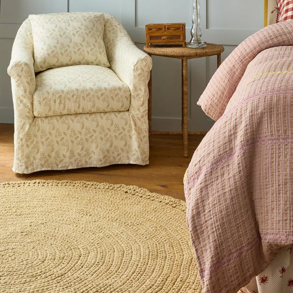 Softly scalloped. Handwoven from 100% recycled poly, our Clia Rug looks lovely under a round table, in a cozy reading corner, or beside a bed. Versatile and durable.