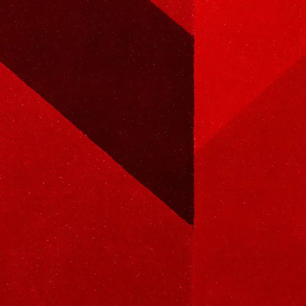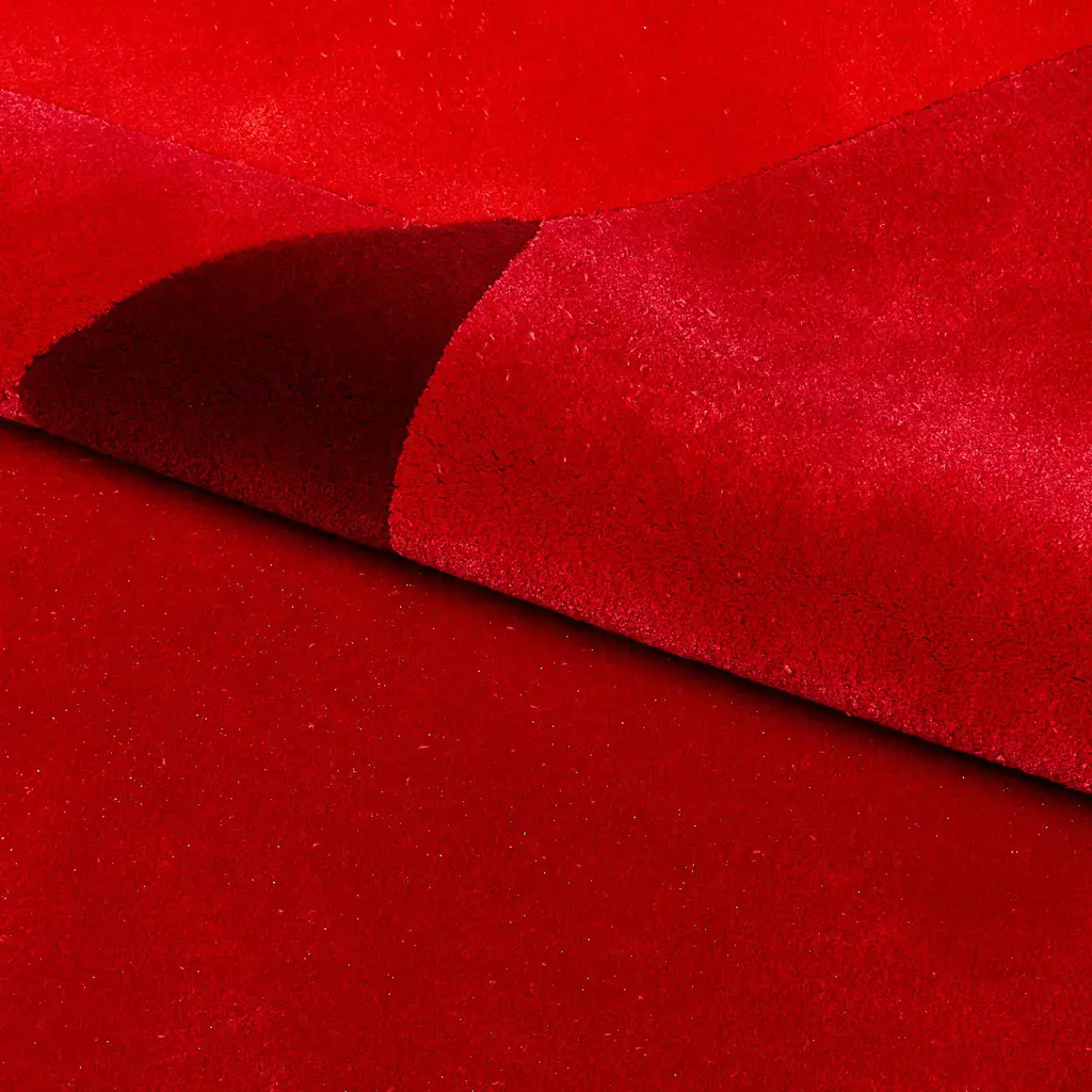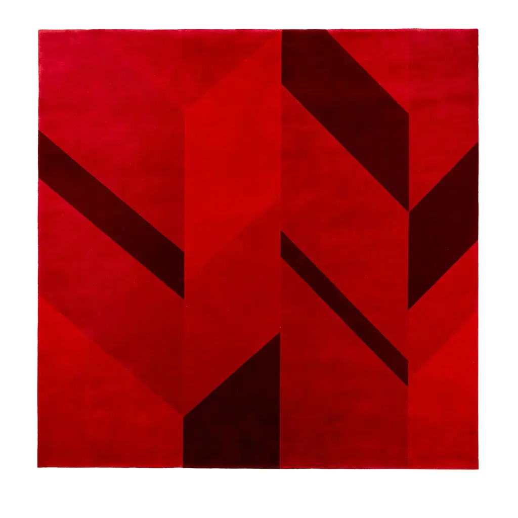 A viscose and wool rug, with a geometric pattern playing with shades of red.