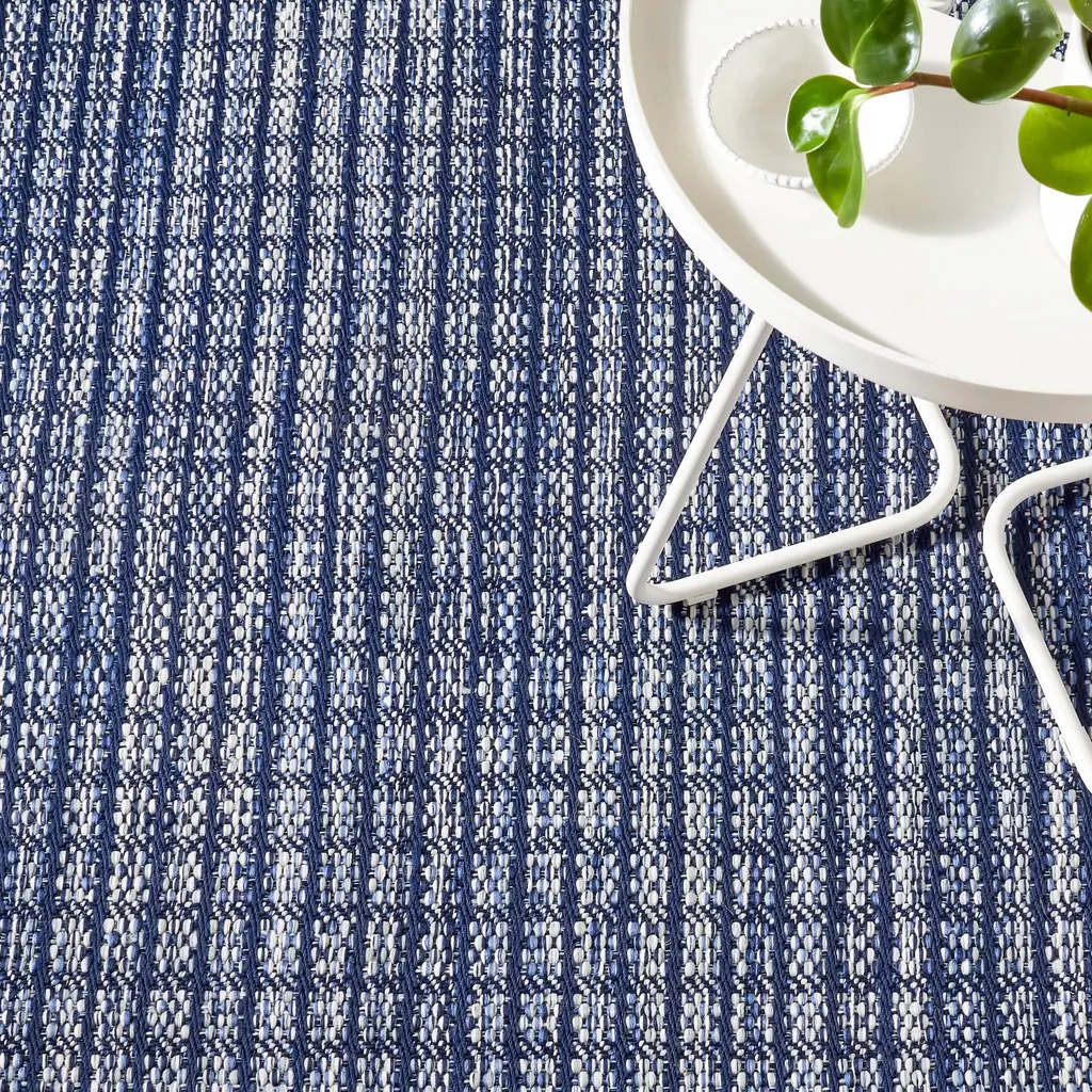Inspired by a colorful knit throw, this indoor/outdoor rug is durable and washable. It features a unique texture produced by a mix of varying shades of blue and ivory yarns that peek through from under a navy checkerboard pattern. Use it to create a cozy feel in high-traffic areas without having to worry about cleanup!