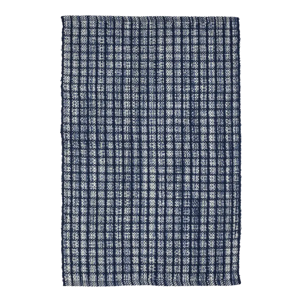 Inspired by a colorful knit throw, this indoor/outdoor rug is durable and washable. It features a unique texture produced by a mix of varying shades of blue and ivory yarns that peek through from under a navy checkerboard pattern. Use it to create a cozy feel in high-traffic areas without having to worry about cleanup!