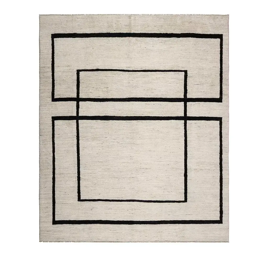 Afghan traditional weaving techniques meet the freshness of contemporary design in this exclusive rug by Carlotta Fortuna. Deftly hand-knotted in Afghan workshops from different prized wool types, it boasts an intricate geometric motif combining black and warm-brown elements emerging against the beige backdrop for a sophisticated neutral palette. Each rug is unique, making it a spot-on addition to geometric-style interiors.