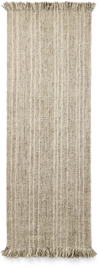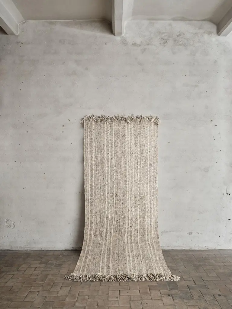 Colonnade no.07 Rug by Cappelen DimyrDimensions: D 100 x H 240 cmMaterials: 100% Wool Colonnade no.07 is a hand-woven wool rug designed for narrow spaces. no.07 has a mid beige melange foundation with a soft sandy shaded stripe, creating a harmonious and delicate effect. This colonnade are designed with the warp running as fringe that elevate the design, providing extra details while exuding a serene ambiance in your room.Cappelen Dimyr is a creative collective based in Copenhagen, passionate about creating contemporary artisanal rugs and tapestries in the finest natural fibers, handcrafted by specialists in India using traditional techniques. The world of Cappelen Dimyr is significantly bohemian, warm and artistic with a clear DNA – conscious, crafted and personal.The point of view is an interpretation of slow luxury with each object carefully designed and produced to stand the test of time.Cappelen Dimyr launched the first chapter of rugs in the autumn of 2019 and now offers both rugs and tapestries, available online and with carefully selected retailers worldwide.