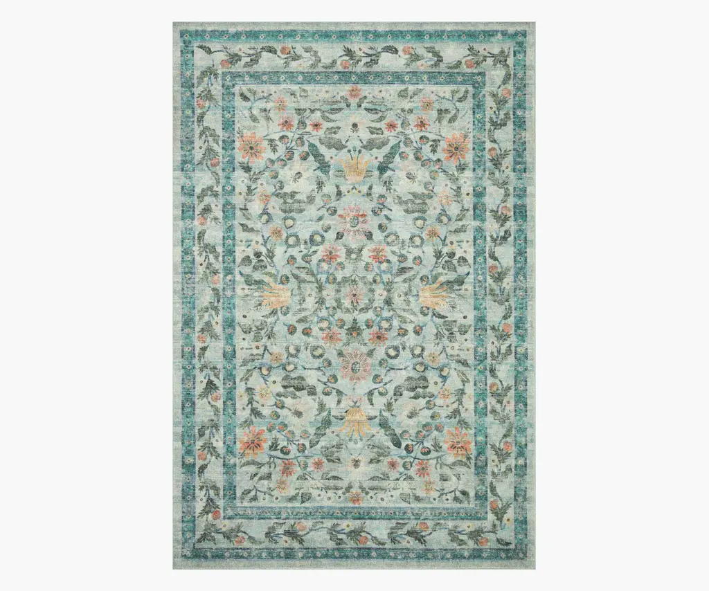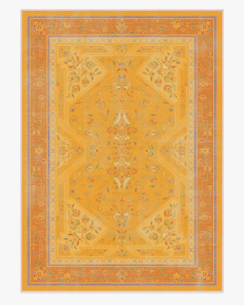 Unleash your creativity with our Iris Apfel Colorful Loom Mango Rug. Inspired by traditional Turkish loom rugs, this bright design reflects Iris' eclectic and luxurious approach to style. It features beautiful motifs drawn from her fashion along with geometric figures inspired by her personal jewelry collection. Its vibrant palette mixes pastel drops of orange, purple, lavender, green, teal, blue, and cream ��� all against a yellow background. Water-resistant, stain-resistant, and machine-washable. Rug colors may vary slightly according to your device and the lighting in your space.