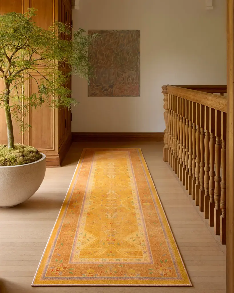 Unleash your creativity with our Iris Apfel Colorful Loom Mango Rug. Inspired by traditional Turkish loom rugs, this bright design reflects Iris' eclectic and luxurious approach to style. It features beautiful motifs drawn from her fashion along with geometric figures inspired by her personal jewelry collection. Its vibrant palette mixes pastel drops of orange, purple, lavender, green, teal, blue, and cream ��� all against a yellow background. Water-resistant, stain-resistant, and machine-washable. Rug colors may vary slightly according to your device and the lighting in your space.