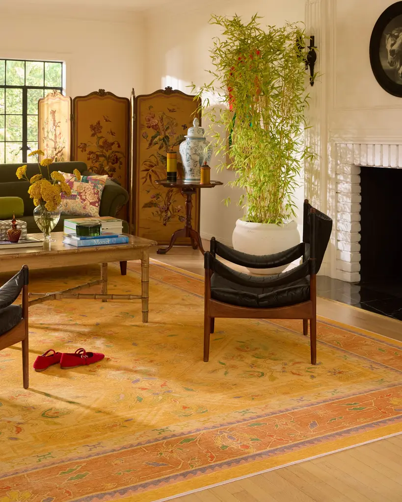 Unleash your creativity with our Iris Apfel Colorful Loom Mango Rug. Inspired by traditional Turkish loom rugs, this bright design reflects Iris' eclectic and luxurious approach to style. It features beautiful motifs drawn from her fashion along with geometric figures inspired by her personal jewelry collection. Its vibrant palette mixes pastel drops of orange, purple, lavender, green, teal, blue, and cream ��� all against a yellow background. Water-resistant, stain-resistant, and machine-washable. Rug colors may vary slightly according to your device and the lighting in your space.