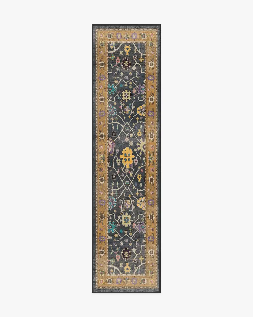 Unleash your creativity with our Iris Apfel Colorful Loom Mango Rug. Inspired by traditional Turkish loom rugs, this bright design reflects Iris' eclectic and luxurious approach to style. It features beautiful motifs drawn from her fashion along with geometric figures inspired by her personal jewelry collection. Its vibrant palette mixes pastel drops of orange, purple, lavender, green, teal, blue, and cream ��� all against a yellow background. Water-resistant, stain-resistant, and machine-washable. Rug colors may vary slightly according to your device and the lighting in your space.