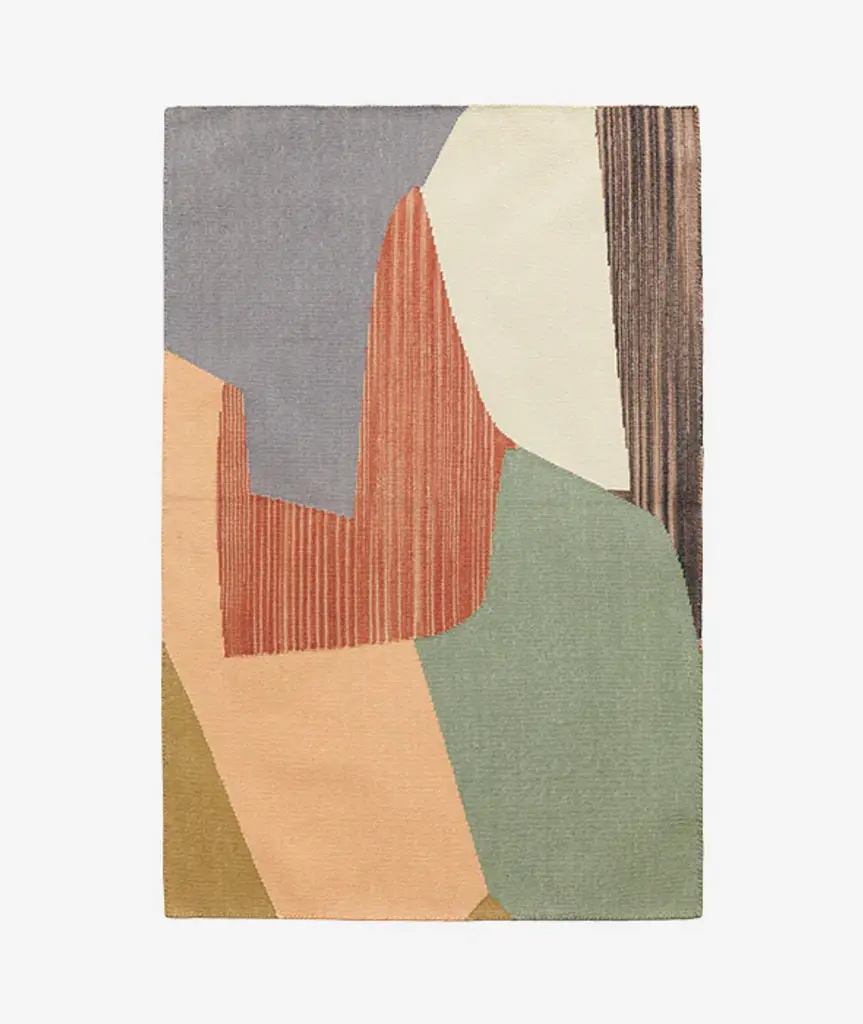 The Composition Area Rug from Scion Living stuns with an abstract, artisanal appeal. A hand-tufted construction woven from pure wool by artisans in India, its pale background is plush and strong. The rug itself is digitally screen-printed, showing off a series of multicolored shapes and irregular outlines across its surface, contrasting the bright colors with the flat background and making each rug an artistic canvas.