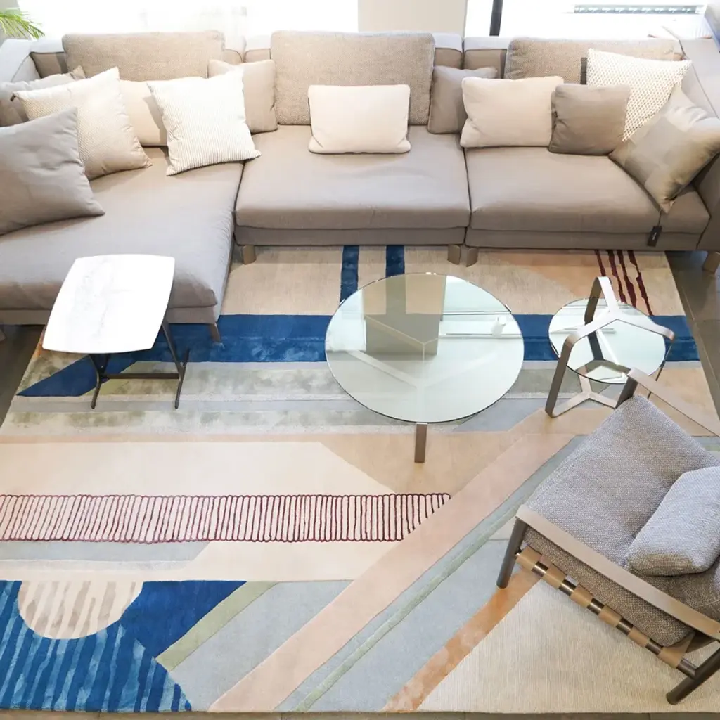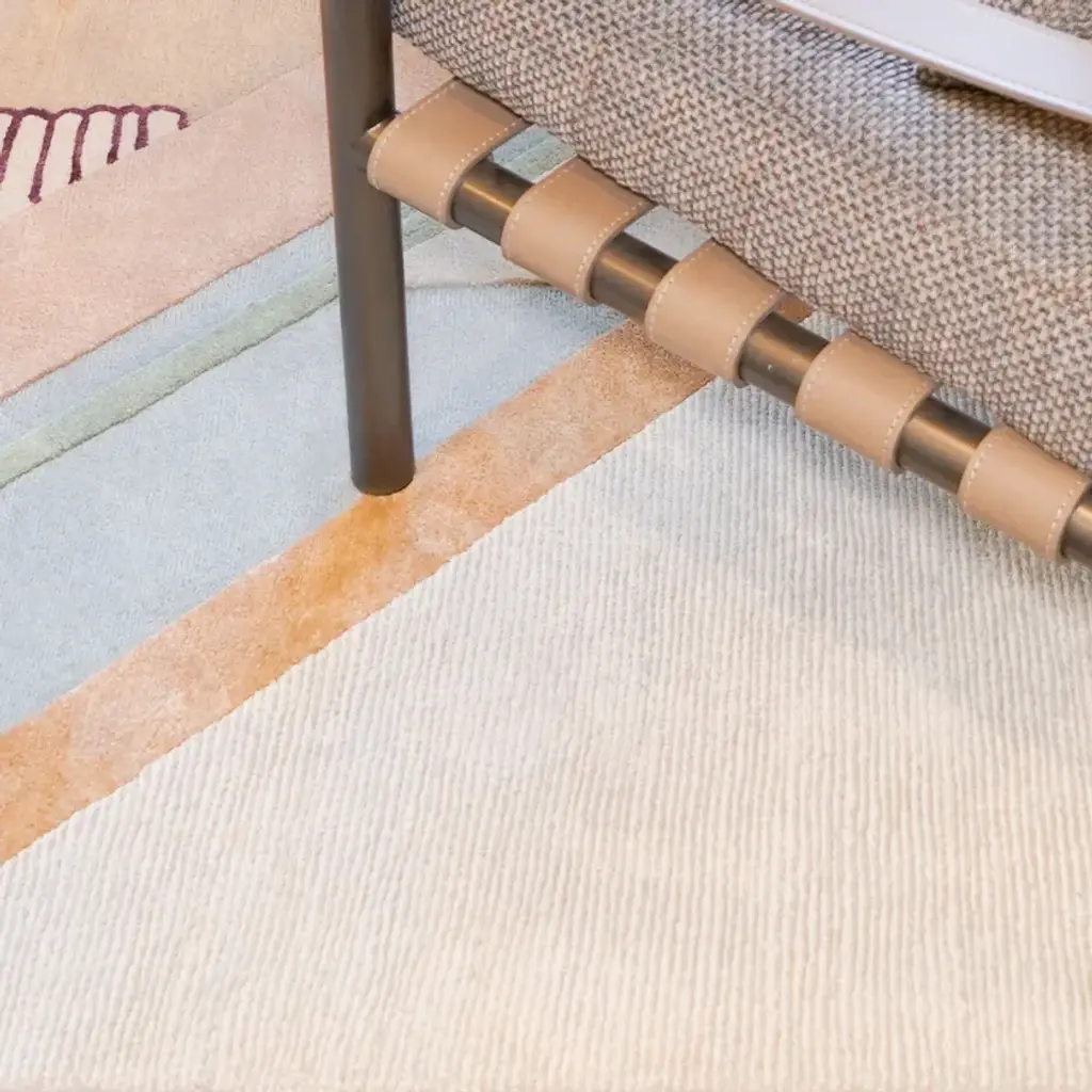 Material: Wool, Silk, Metallic yarnKnot Density: 100 knots/inch²Pile Height: 4 - 8mmTechnique: Hand-knottedCustom sizes and colors on requestThe Abstraction collection is based on the ideas of abstractionism and the generalization of forms. Still, instead of translating an image into its simplified form, Tapis Rouge created complex compositions from the interaction of multiple forms, colors, and geometric proportions. Experimentation is extended to the shape of the rug, which in some cases is round, to the fibers used, to knotting techniques, metallic details, different pile heights, and color combinations with a strong personality. Composition I.I hand-knotted rug with a knot density of 100knots/inch² comprises 33% Wool, 65% Silk, and 2% Metallic yarn with sculpted details that rise from the carving phase. The alternate engraved and embossed pile levels from 4 to 6 mm heights emphasize the design's forms.The rug can be ordered in four standard sizes or by custom request.