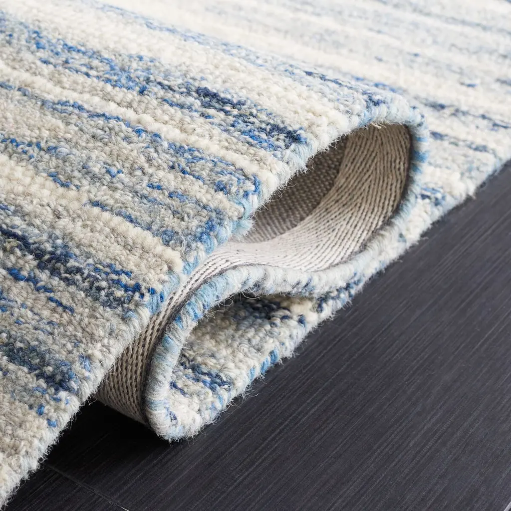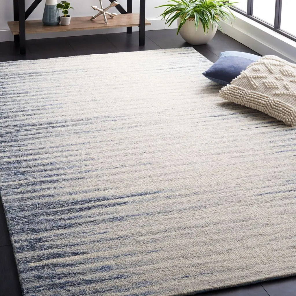 Elevate your home with the timeless sophistication of our 4' x 6' hand-tufted wool area rug from India. Meticulously crafted in a small rectangle shape, this rug features a beautiful blend of ivory and dark blue hues, creating a serene oceanic ambiance in your space. The contemporary style is accentuated by a subtle yet elegant linear pattern that provides texture and depth, evoking the gentle ebb and flow of waves on a tranquil shore. This rug's plush wool construction not only offers a soft underfoot but also delivers durability that can withstand the ebb and flow of daily life. Perfect for adding a touch of modernity to any room, this rug promises to be a captivating centerpiece in your home d?cor.