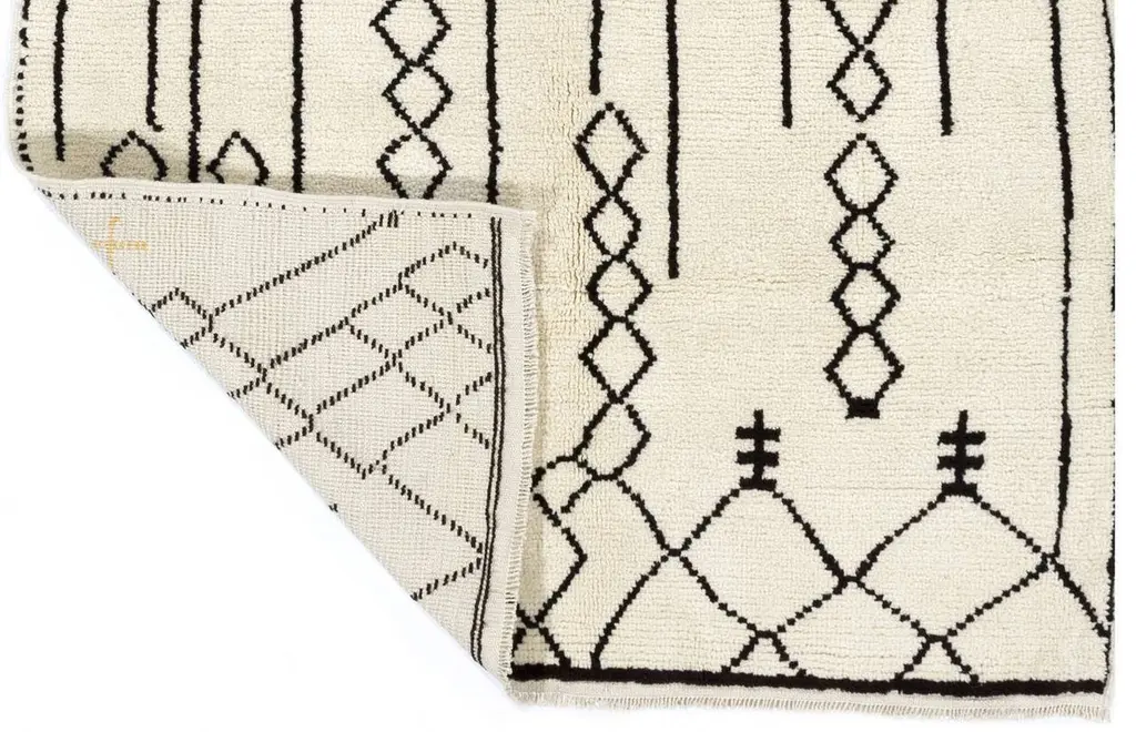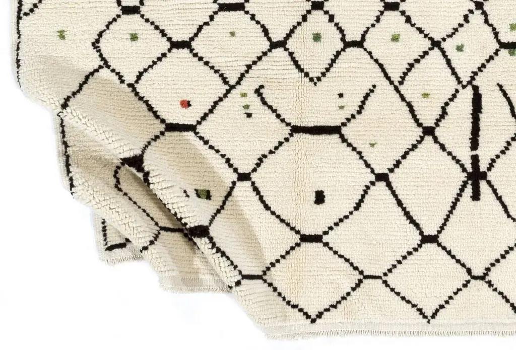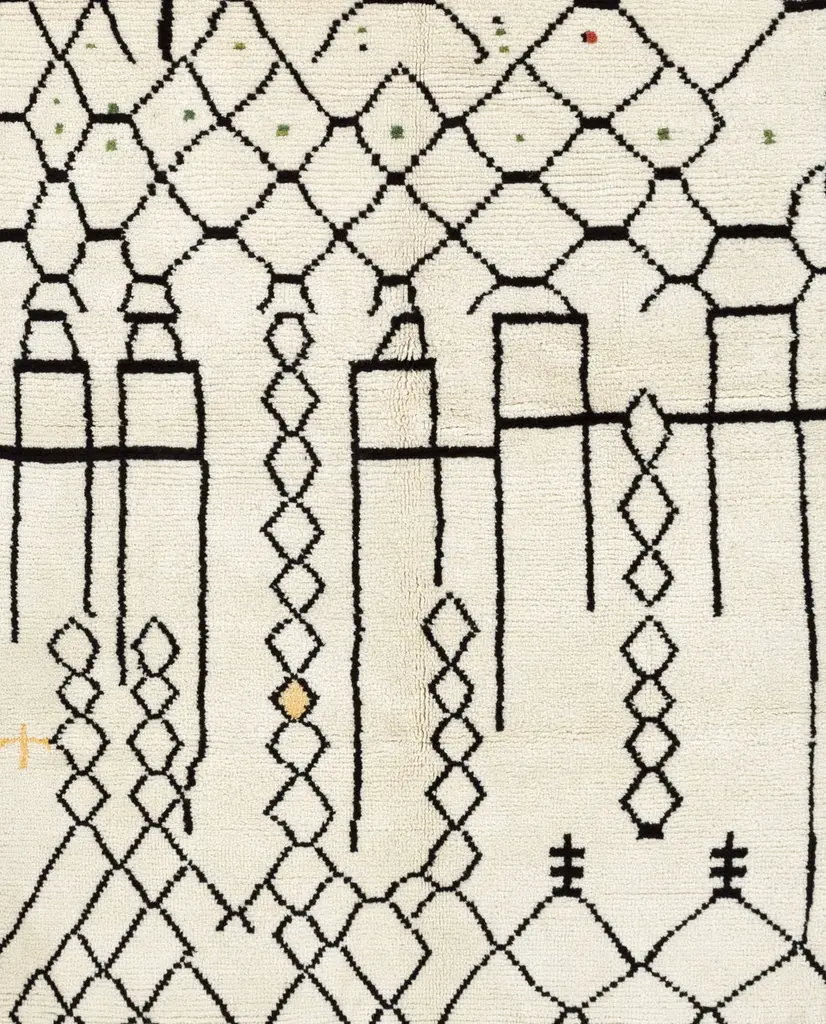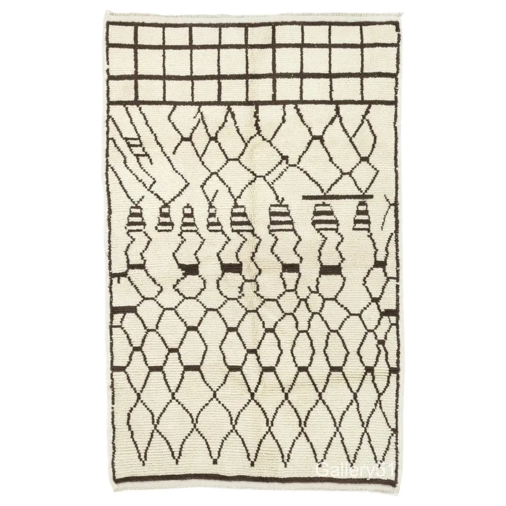 A contemporary hand knotted Moroccan rug inspired by the Berber culture in the Atlas mountains, with soft, lush, velvety pile, made of hand-spun natural lamb's wool in un-dyed ivory and brown. It has a lattices and columns design.The rug can be custom-produced in any size and color combination requested within usually 5 weeks depending on the size.