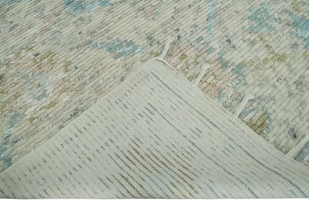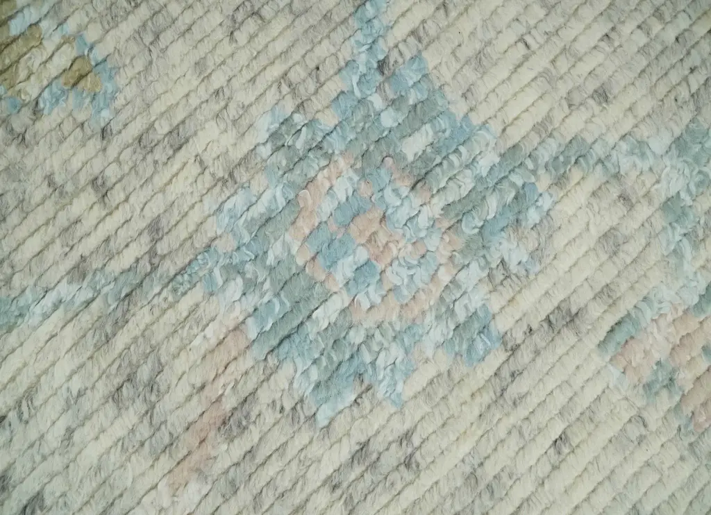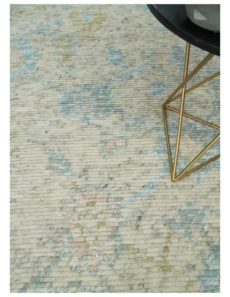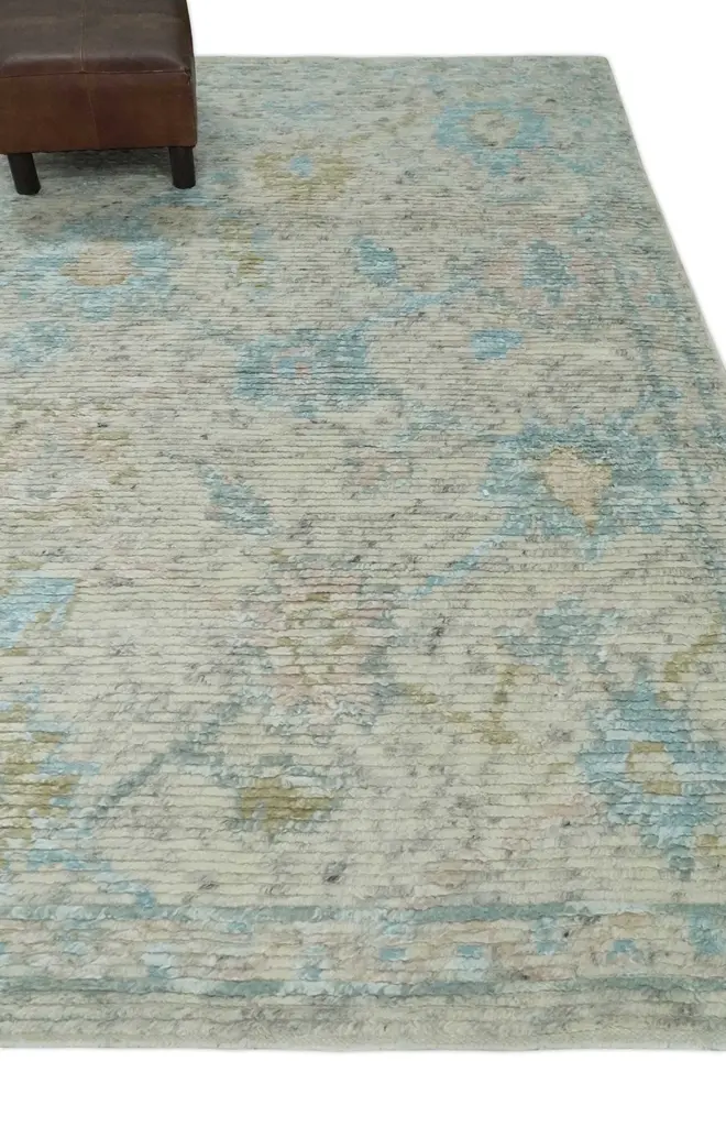 The Resurrected collection consists of rugs that carry the age-old designs, colors, and patterns of handmade rugs with a new and fresh feel to them. This Hand-Knotted Rug has been Made with Handspun Wool. The beautiful colors of the rug carry a legacy of the famous Oushak rug, the traditional design completes your space without making it look busy. Oushak rugs are durable and can last for decades if treated right. Hand-Knotted SIZES ARE MADE TO ORDER IN 30-45 DAYS Made with Wool Color : Ivory and Teal This specific rug is made in India, in the city of Bhadohi. Bhadohi is one of the biggest rug manufacturing cities. Carpet weaving in the region dates back to the 16th century during the reign of Akbar. The skilled artisans of Bhadohi have been carrying the tradition of rug-making for centuries. USERS GUIDE Avoid prolonged moisture Vacuum regularly and/or shake to remove dust Do not pull any loose threads. Use scissors to simply cut the ends The blot spills immediately with a white cloth. Harsh chemicals may damage or fade the rug Use rug protectors under heavy furniture