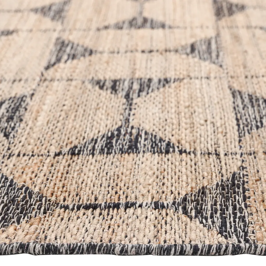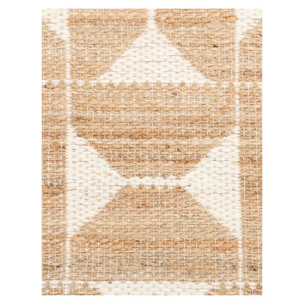 This Contemporary Jute Blend Rug offers a durable and stylish flooring solution for various living spaces. Measuring 2'6" x 8', this runner is designed for placement in hallways, entryways, or to define zones within larger rooms. The rug is constructed from a blend of natural fibers, featuring 60% jute and 40% cotton. Jute provides durability and a distinct natural texture, while cotton adds softness and structural integrity. The flatweave construction contributes to the rug's strength and allows for a low profile, suitable for areas with frequent foot traffic. The design showcases a distinct geometric pattern. A natural brown hue, characteristic of jute, forms the base color. This is complemented by a repeating dark contrasting pattern of stylized hourglass or bowtie shapes arranged within a grid. This graphic motif provides visual interest and a modern aesthetic. Handcrafted in India, this rug combines traditional techniques with a contemporary design sensibility. It is suitable for modern, casual, or transitional interiors, adding both texture and pattern without overwhelming a space. The natural fiber composition makes it a practical choice for everyday use.